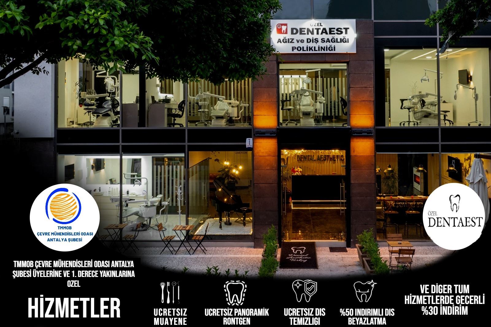 Şube üyelerimize, eş ve 1. Dereceden tüm yakınlarının (anne, baba, çocuk) muayene ve tedavilerinde; % 30 indirim uygulanacaktır. Muayene, diş temizliği ve röntgen çekimlerinin ücretsizdir.