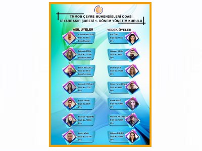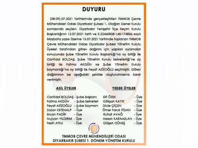 (08-09).07.2021 tarihlerinde gerçekleştirilen TMMOB Çevre Mühendisleri Odası Diyarbakır Şubesi 1. Olağan Genel Kurulu sonrasında seçilen, Diyarbakır Yenişehir İlçe Seçim Kurulu Başkanlığı 12.07.2021 tarih ve E.22460828-140-174836 sayılı Mazbata yazısı üzerine 13.07.2021 tarihinde toplanan TMMOB Çevre Mühendisleri Odası Diyarbakır Şubesi Yönetim Kurulu Üyeleri tarafından görev dağılımı için yapılan oylamalar sonucunda Şube Yönetim Kurulu Başkanlığı`na oy birliği ile Canfidal BOLDAŞ, Şube Yönetim Kurulu Sekreterliği`ne oy birliği ile Fatma AKGÜN ve Şube Yönetim Kurulu Saymanlığı`na oy birliği ile Feyat AZİZOĞLU seçilmiştir. Görev dağılımının ise aşağıdaki şekilde oluşturulmasına karar verilmiştir.