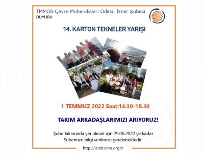 Çevre Mühendisleri Odası İzmir Şubesi olarak geçen senelerde olduğu gibi bu sene de karton tekneler yarışına üyelerimizden oluşturduğumuz takımımızla katılacağız. Takımımızda yer alarak yarışmaya katılmak ve keyifli bir gün geçirmek isteyen üyelerimizin 29.06.2022 tarihine kadar odamıza isimlerini bildirmelerini rica ediyoruz.