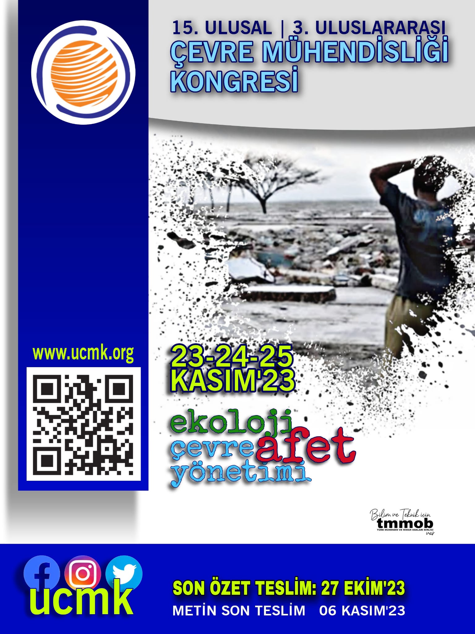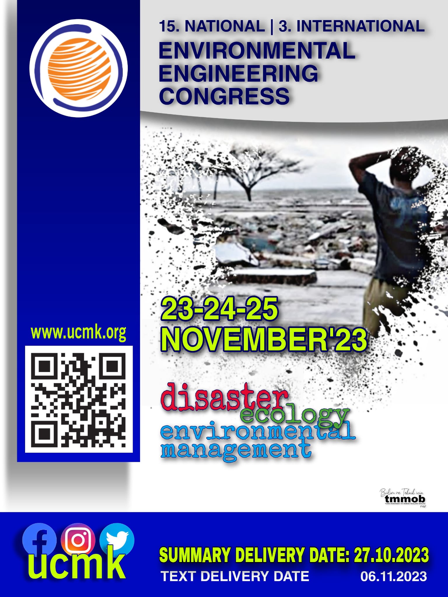 15. ULUSAL 3. ULUSLARARASI ÇEVRE MÜHENDİSLİĞİ KONGRESİ 23-24-25 Kasım 2023 tarihinde online olarak düzenlenecektir.