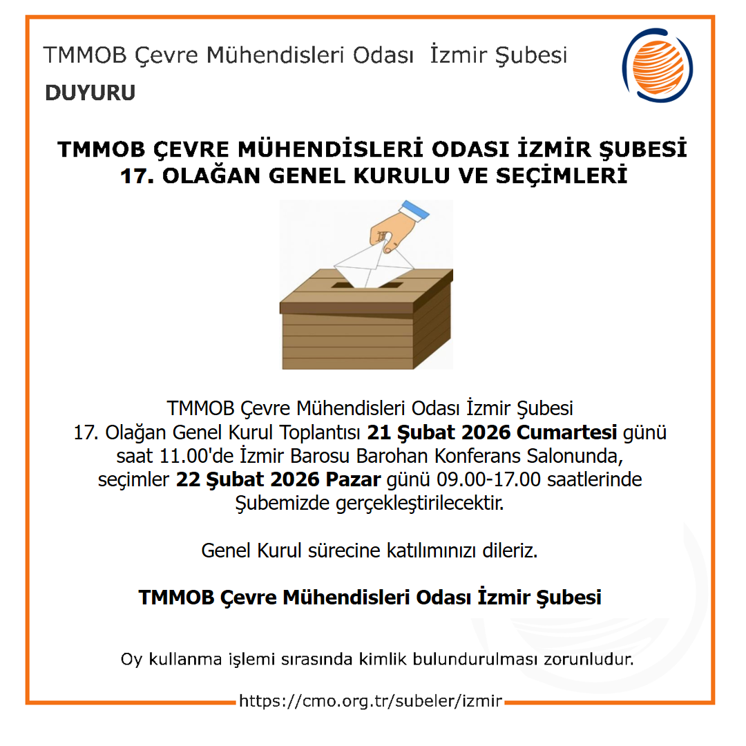 TMMOB Çevre Mühendisleri Odası İzmir Şubesi 17. Olağan Genel Kurul Toplantısı 21 Şubat 2026 Cumartesi günü saat 11.00'de İzmir Barosu Barohan Konferans Salonunda, seçimler 22 Şubat 2026 Pazar günü 09.00-17.00 saatlerinde Şubemizde gerçekleştirilecektir.
