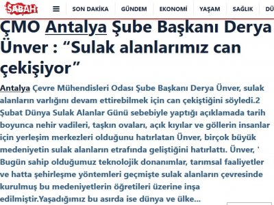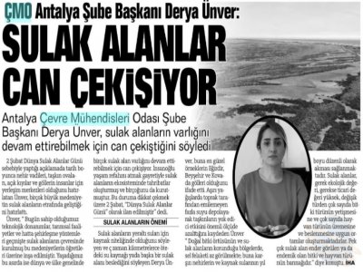 Şube Başkanımız Derya Ünver, 2 Şubat Dünya Sulak Alanlar Günü sebebiyle basın açıklaması yayınladı. Açıklamasında, birçok medeniyetin sulak alanlar etrafında geliştiğini hatırlatan Ünver, yaşadığımız dönemde birçok sulak alanın varlığının büyük tehdit altında olduğunu belirtti. İnsanoğlunun yaşam konforu için sulak alanların ekosisteminde tahribata yol açtığını, bu duruma dikkat çekmek amacıyla 2 Şubat’ın ‘Dünya Sulak Alanlar Günü’ olarak ilan edildiğini söyledi.