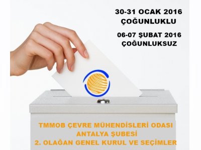 TMMOB Çevre Mühendisleri Odası Antalya Şubesi II. Olağan Genel Kurulunun 30 Ocak 2016 Cumartesi günü saat 09.00 da, Seçimleri ise 31 Ocak 2016 Pazar günü saat 09.00 "Meltem Mahallesi Meltem Bulvarı Batıkent Sitesi A Blok K:2 D:3 Muratpaşa/ ANTALYA" adresinde çoğunluk sağlanmak koşulu ile aşağıda belirtilen gündem maddeleri doğrultusunda yapılacaktır.