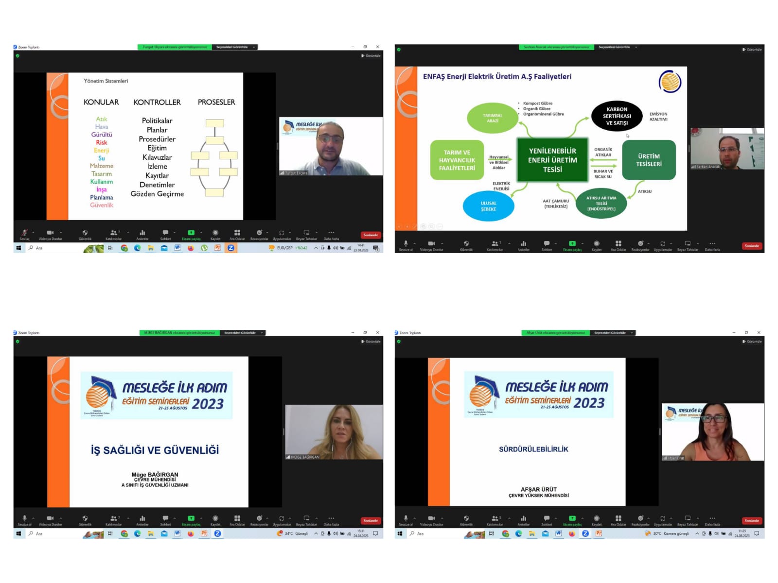 • TMMOB, ÇMO, Örgütlenme ve Mesleki Haklar • ÇED Süreci ve Uygulama Esasları • Danışmanlık Süreci ve Çevre İzin Lisans Uygulamaları • Hava Kalitesi Yönetim Süreci ve Uygulamaları • Çevresel Gürültü Yönetimi Ve Uygulamaları • LPG Otogaz İstasyonlarında Sorumlu Müdürlük • İçme Suyu ve Atıksu Arıtma Tesisleri Projelendirilmesi • Atıksu Arıtma Tesislerinin İşletilmesi • Yönetim Sistemleri • Kamu İhale Kanunu Tanımları, Uygulamaları, Süreçleri • Arge,-İnovasyon ve Proje Yönetimi Süreçleri • İş Sağlığı ve Güvenliği • Yeraltı-Yerüstü Su Kaynakları Ve Havza Yönetimi • Su Kalitesi İzleme ve Değerlendirme Çalışmaları • Evsel Nitelikli Katı Atıkların Yönetilmesi • Şantiye Yönetimi • Sürdürülebilirlik • Biyogaz Tesisleri Kurulum ve İşletim Esasları • İçme Suyu Arıtma Tesislerinin İşletilmesi • Arıtma Çamurlarının Yönetimi • Yurtdışı Eğitim ve Çalışma • Özgeçmiş Hazırlama ve Mülakat Teknikleri • OSB‘lerde Çevre Yönetimi • Çevre Mühendisliğinde CBS Uygulamaları olmak üzere 25 farklı alanda konusunda uzman meslektaşlarımız tarafından genel bilgilendirmeler yapılarak deneyimleri paylaşılmıştır.