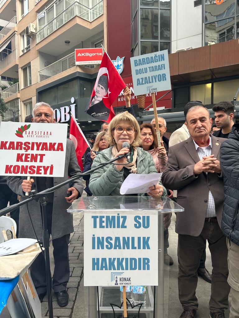 Alsancak Türkan Saylan Kültür Merkezi önünde düzenlenen ortak basın açıklamasında Çevre Mühendisleri Odası İzmir Şube Teknik Sorumlusu Selma Akdoğan suyun yaşam hakkı olduğunu vurgulayarak Çevre Mühendisleri Odası İzmir Şubesi ve TMMOB İzmir İl Koordinasyon Kurulu olarak her yıl düzenlenen etkinliklerde suyumuzu, yaşamımızı, doğamızı korumak için kamusal, toplumsal ve mesleki sorumlulukları çerçevesinde sözlerini söylediklerini aktardı. Deprem sonrası temiz su, tuvalet ve duş ihtiyacının karşılanamadığını, sürecin suyun yaşam için ne kadar önemli olduğunu bir kez daha gösterdiğini belirtti. Olan suyun her geçen gün azaldığını ve kirlendiğini vurgulayarak su kaynaklarını maden, enerji, sanayi, turizm projeleri için feda eden rant politikalarını eleştirdi. Kentlerin doğa ile uyumlu ve afetlere dirençli hale dönüşmesi gerektiğini ifade etti. Suyun ticari bir meta haline gelmesini eleştirerek suyumuzu korumak için mücadeleye devam edeceklerini söyledi.