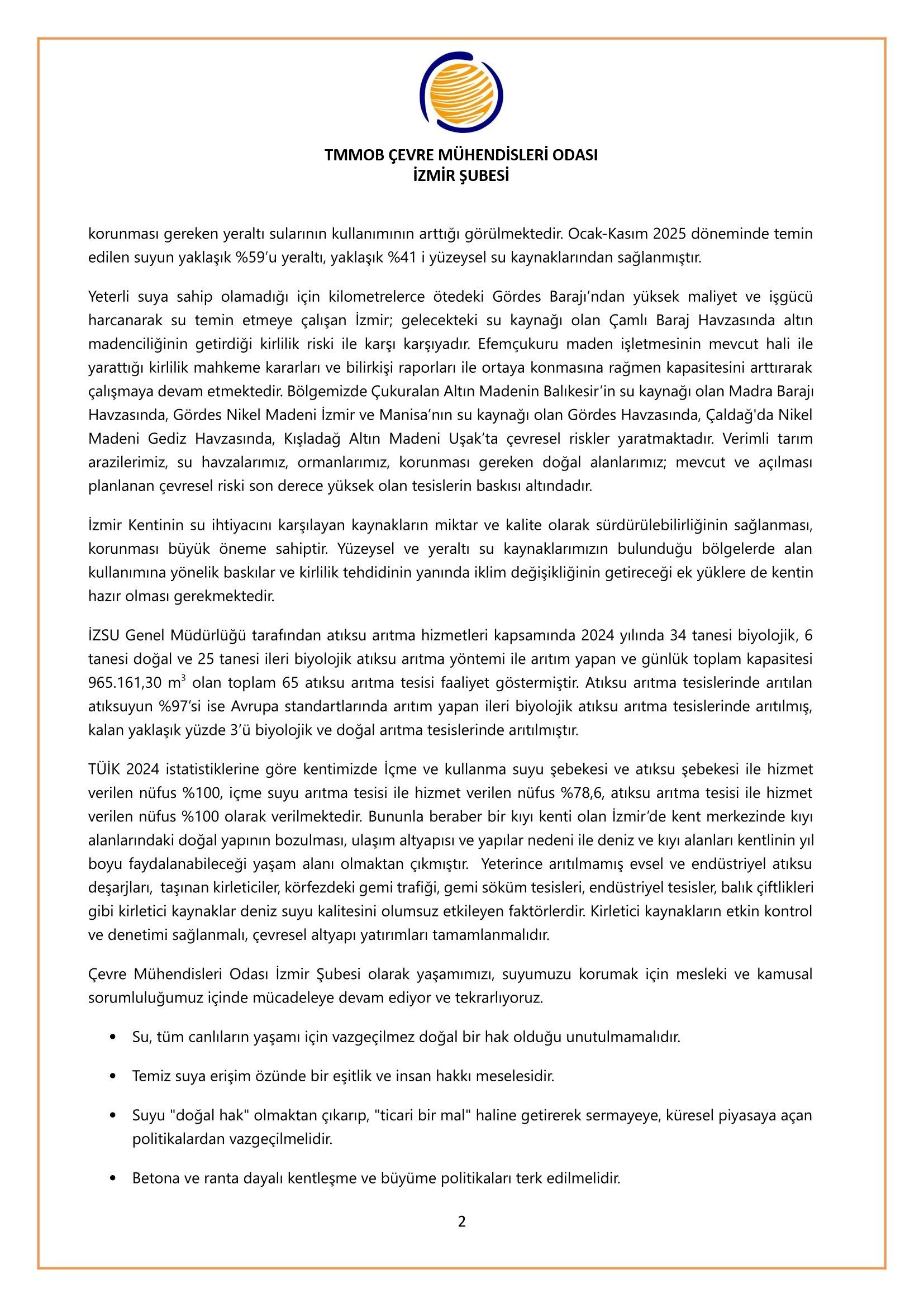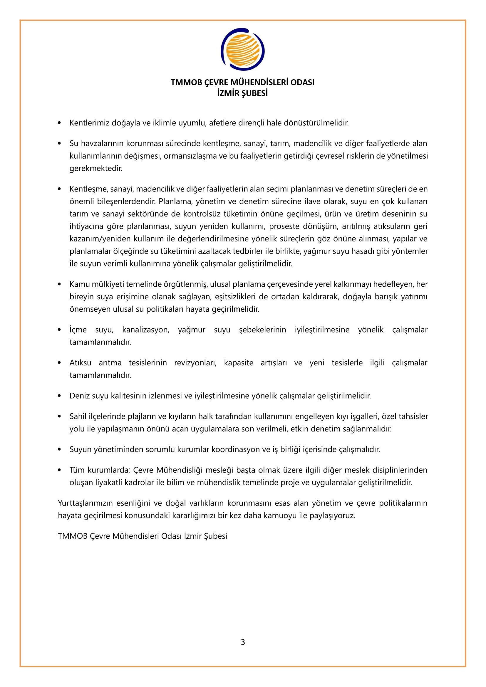 Çevre Mühendisleri Odası İzmir Şubesi olarak yaşamımızı, suyumuzu korumak için mesleki ve kamusal sorumluluğumuz içinde mücadeleye devam ediyor ve tekrarlıyoruz.