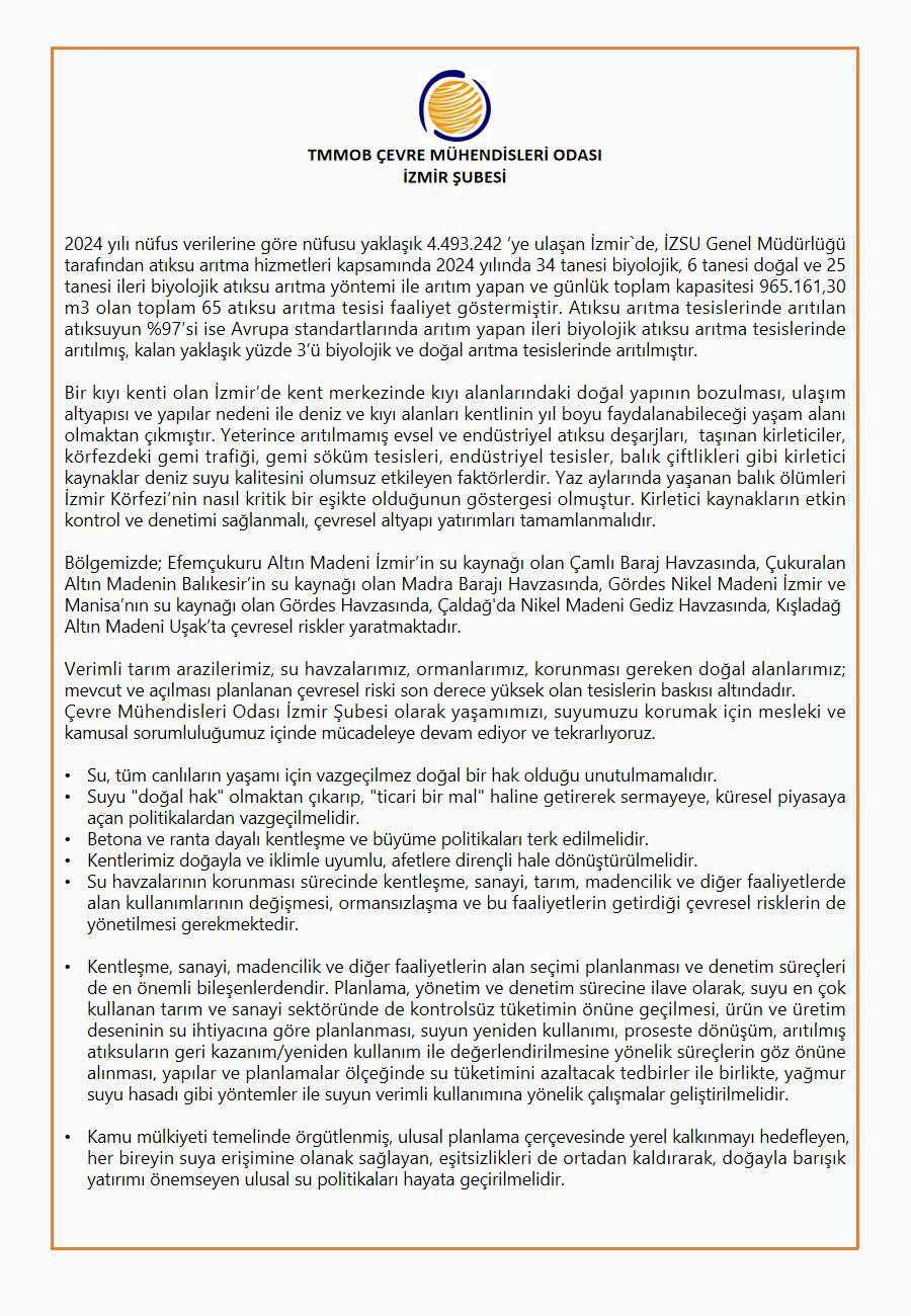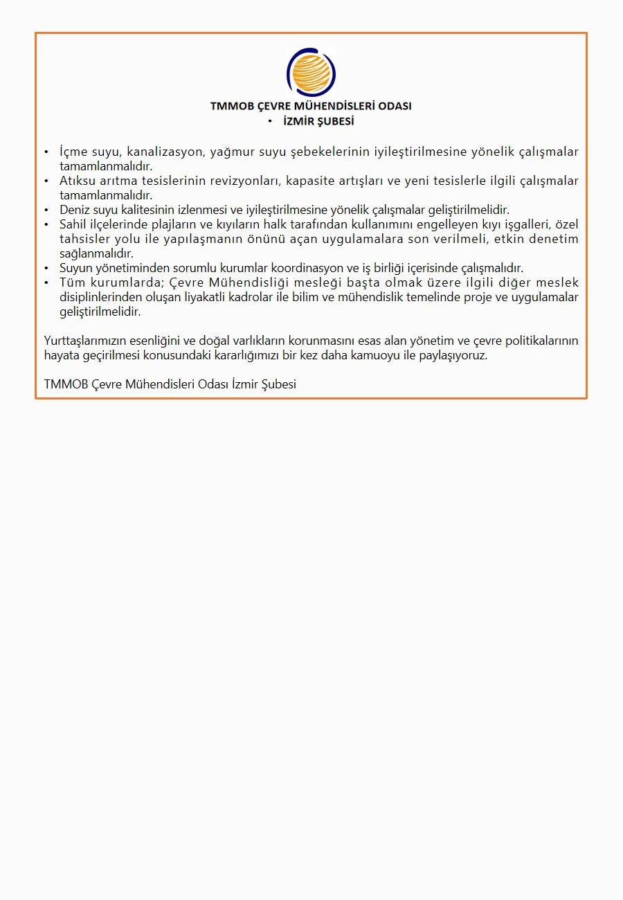 Çevre Mühendisleri Odası İzmir Şubesi olarak yaşamımızı, suyumuzu korumak için mesleki ve kamusal sorumluluğumuz içinde mücadeleye devam ediyor ve tekrarlıyoruz.