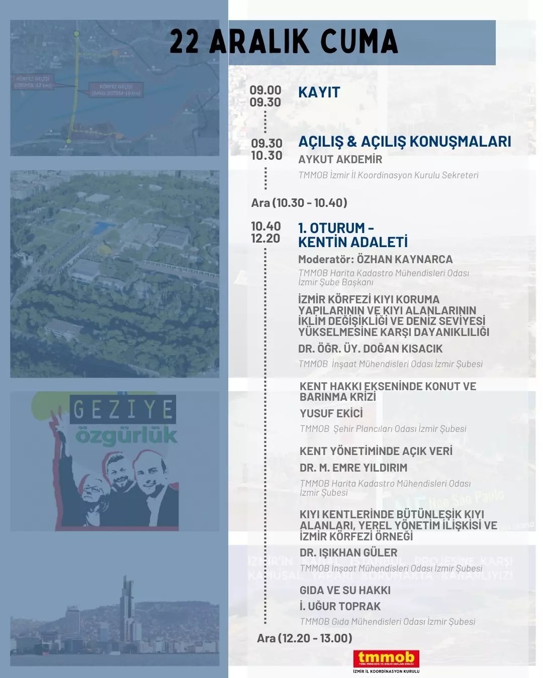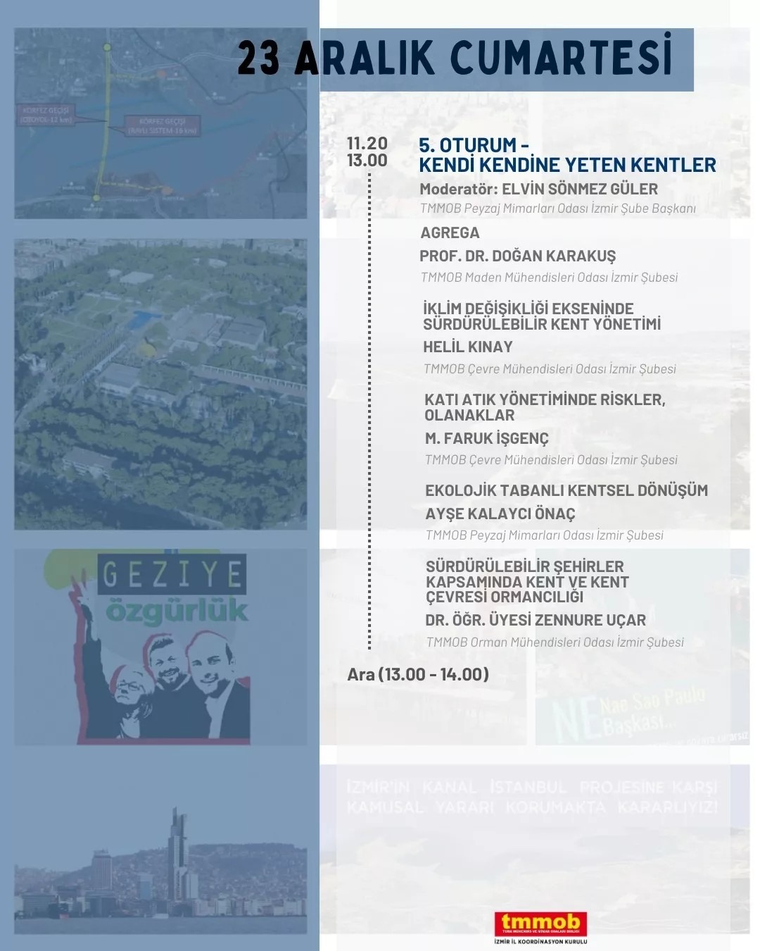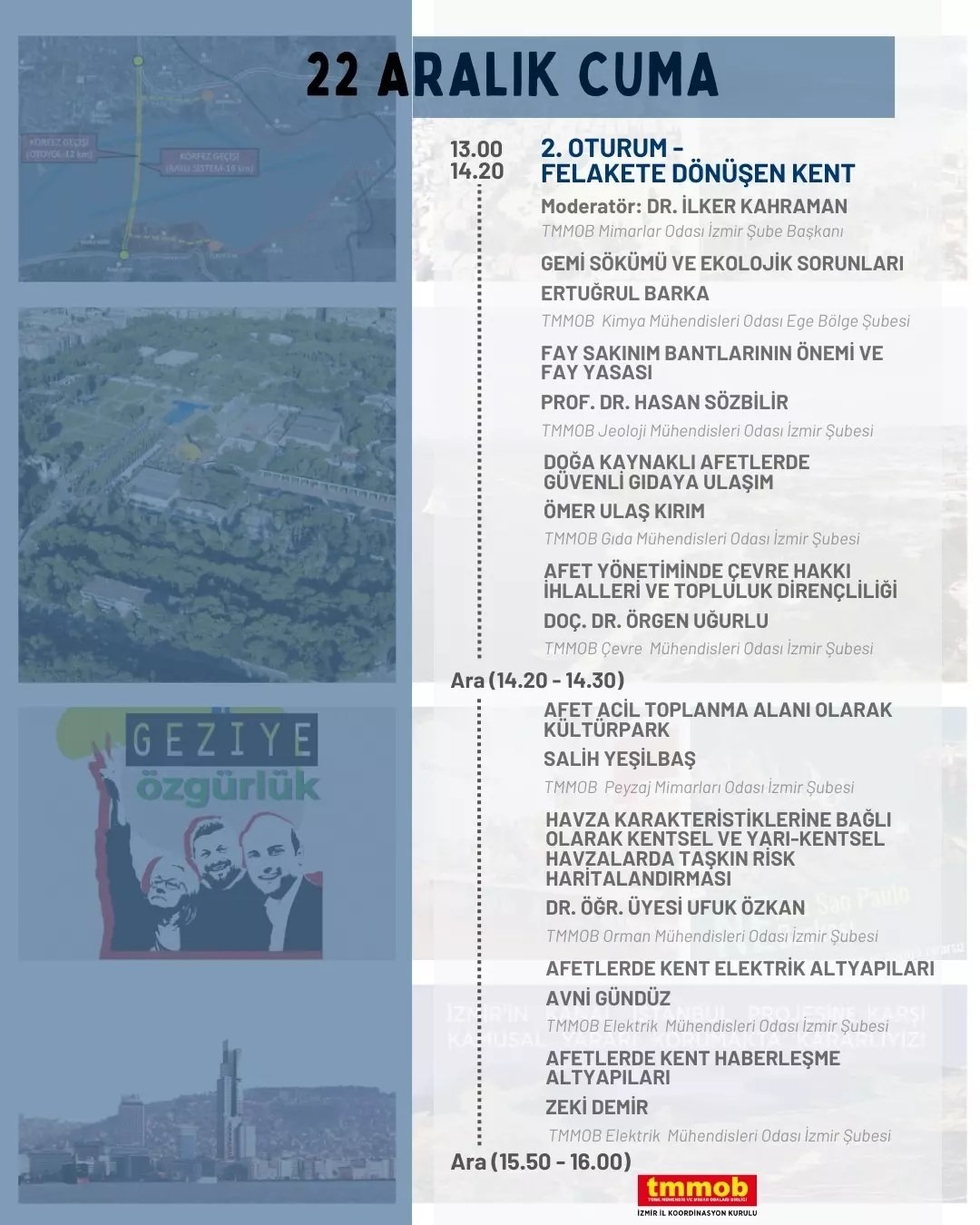 Sağlıklı, güvenli ve adil yaşam haklarımız için kent mücadelesini yürüten TMMOB'ye bağlı meslek odalarının kentlerimizin mevcut durumu, kent planlaması ve yönetimi, afetler, kent suçları ve adaleti konulu sunum ve paylaşımlar ile “Nasıl Bir Kent? Nasıl Bir İzmir?” sorusunun yanıtını arayacağı "Direnen Kentlerde Adalet ve Demokrasi" başlıklı sempozyum kapsamında Şubemiz adına;“Afet Yönetiminde Çevre Hakkı İhlalleri Ve Topluluk Dirençliliği”, "İzmir Çevre Profili",“İklim Değişikliği Ekseninde Sürdürülebilir Kent Yönetimi” ve “Katı Atık Yönetiminde Riskler, Olanaklar” konulu sunumlar yer alacaktır.