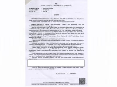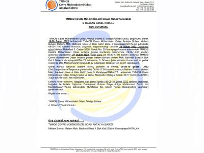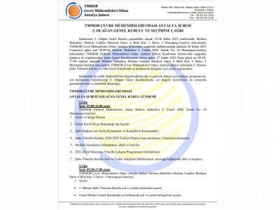 TMMOB Çevre Mühendisleri Odası Antalya Şubesi 5. Olağan Genel Kurulu, çoğunluklu olarak 19-20 Şubat 2022 tarihlerinde TMMOB Çevre Mühendisleri Odası Antalya Şubesi Meltem Bulvarı Meltem Mah. Batıkent Sitesi A Blok Kat:2 Daire 3 Muratpaşa/ANTALYA adresinde 09:00-17:00 saatleri arasında; çoğunluk sağlanamadığı takdirde 26 Şubat 2022 Cumartesi günü Meltem Mahallesi 3. Cadde 3808. Sokak No: 20 Muratpaşa/Antalya adresindeki TMMOB Elektrik Mühendisleri Odası Antalya Şubesi Konferans Salonu`nda, 09:00-14:00 saatleri arasında yapılacaktır. 27 Şubat 2022 Pazar günü ise 09:30-17:00 saatleri arasında TMMOB Çevre Mühendisleri Odası Antalya Şubesi Meltem Bulvarı Meltem Mah. Batıkent Sitesi A Blok Kat:2 Daire 3 Muratpaşa/ANTALYA adresinde, 5. Dönem Şube Yönetim Kurulu asil ve yedek üyeleri ile Oda Merkez Genel Kurulunda oy kullanacak delegeler için seçim yapılacaktır.