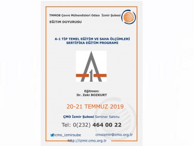 Çevre Mühendisleri Odası İzmir Şubesi olarak, 20-21 Temmuz 2019 tarihleri arasında A-1 Tipi Temel Eğitim ve Saha Ölçümleri` Sertifika Eğitim Programı` düzenlenecektir. Eğitim içeriği ekte yer almaktadır.