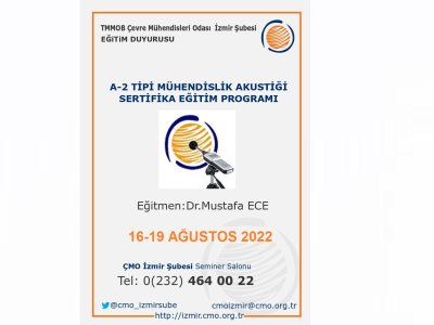 Çevre Mühendisleri Odası İzmir Şubesi olarak, 16-19 Ağustos 2022 tarihleri arasında A-2 Tipi Mühendislik Akustiği Sertifika Eğitim Programı düzenlenecektir. Eğitim içeriği ve başvuru formu ekte yer almaktadır.