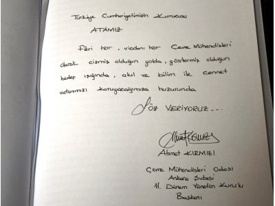 Şube Başkanımız Ahmet Kırmızının Resmi Tören ile Mozoleye çelenk bırakmasının ardından "Anıtkabir Özel Defteri"ne tüm çevre mühendisleri adına yazdığı sözler ile tören sona ermiştir. Anıtkabir Özel Defterine yazılan yazımızın içeriği aşağıdaki gibidir.