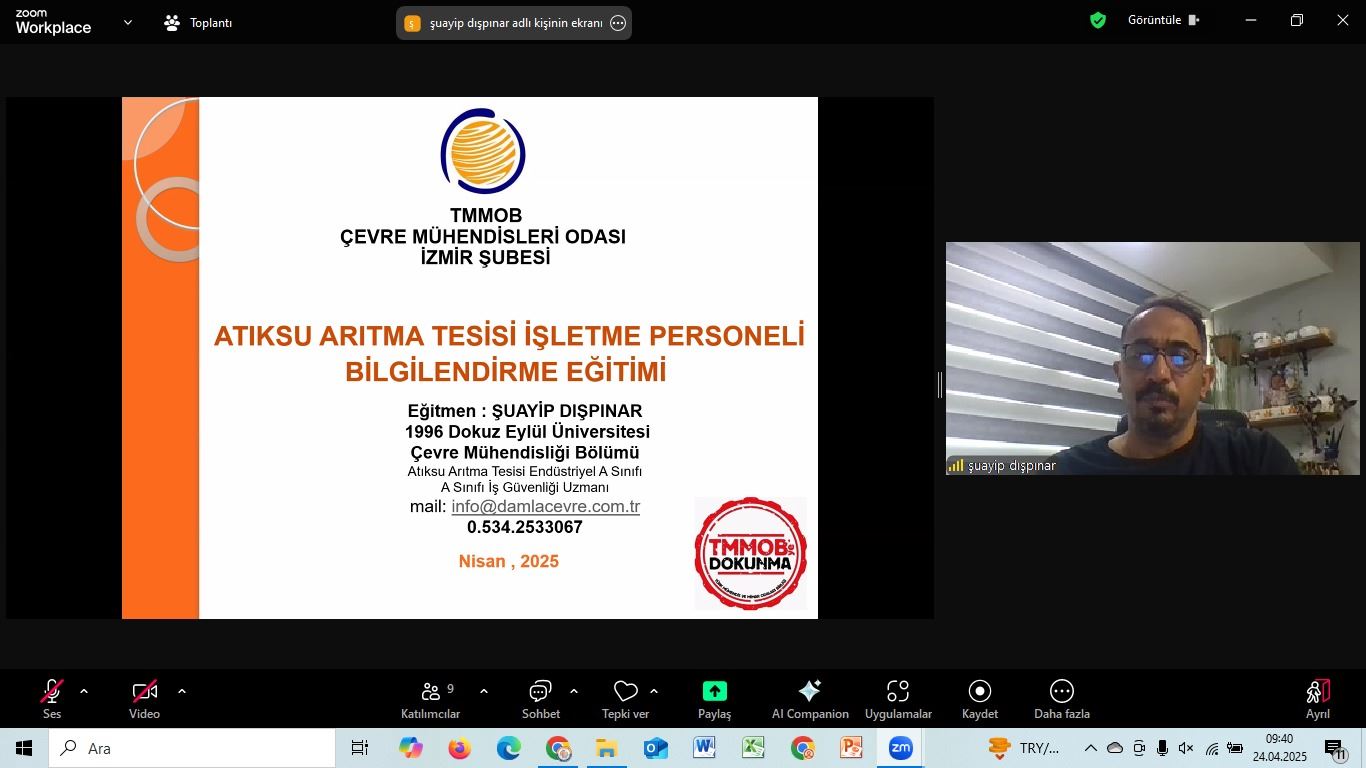 Odamız Online eğitimleri kapsamında Atıksu Arıtma Tesisi İşletme Personellerine yönelik Atıksu Arıtma Tesisi İşletme Personeli Bilgilendirme Eğitimimiz 24-25 Nisan 2025 tarihlerinde gerçekleştirilmiştir.