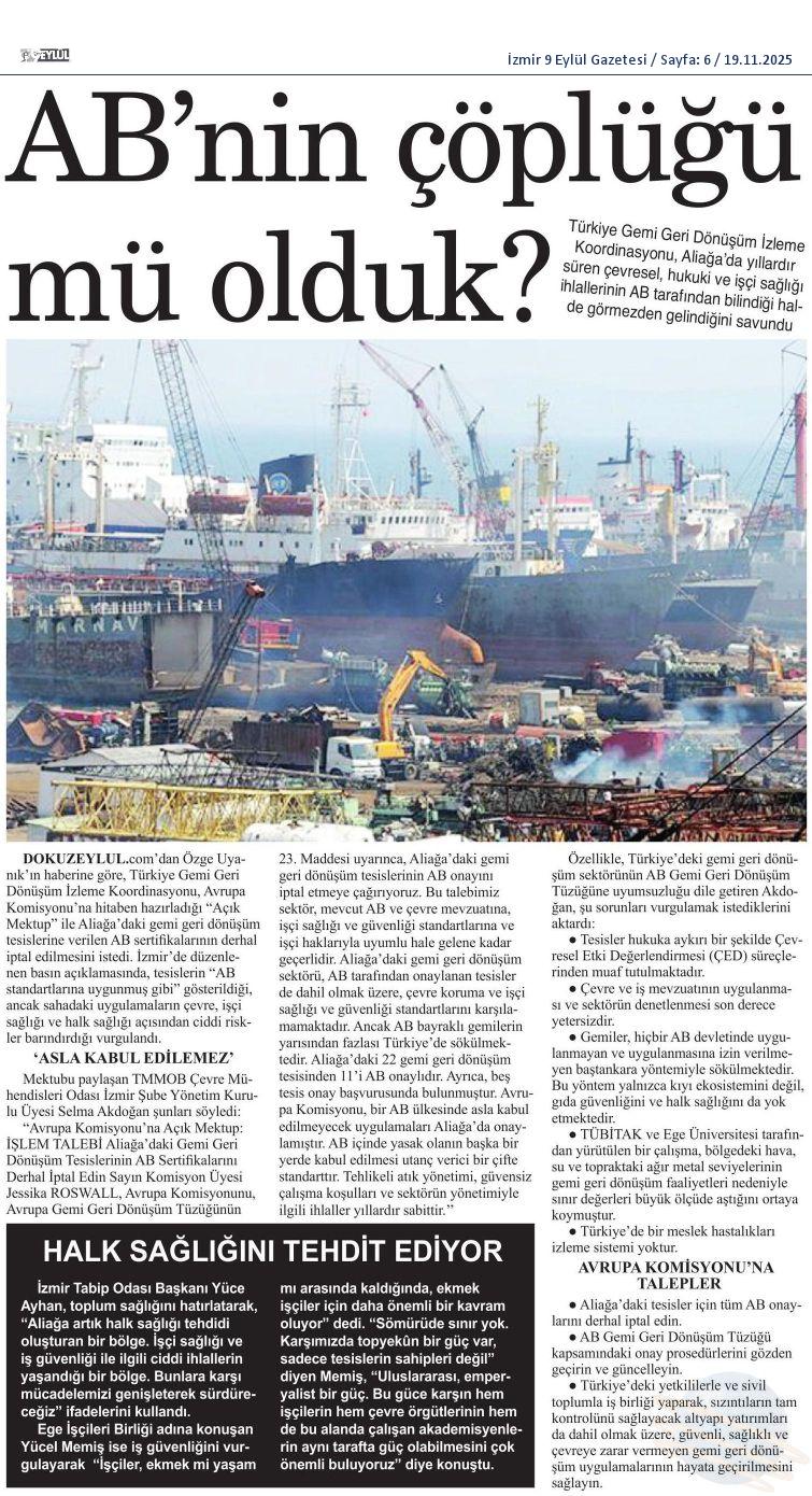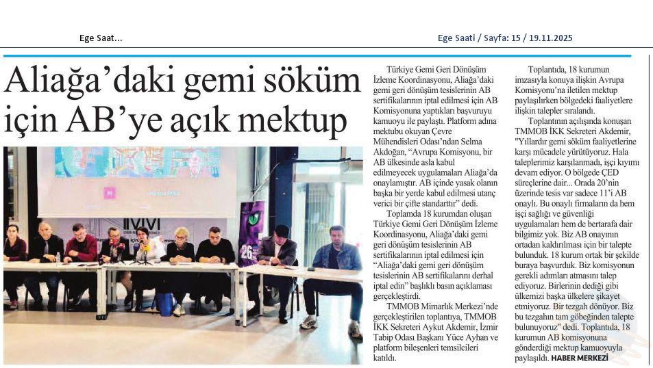 ALİAĞA'DAKİ GEMİ SÖKÜM İÇİN AB'YE AÇIK MEKTUP (Ege Saati, 19.11.2025)
