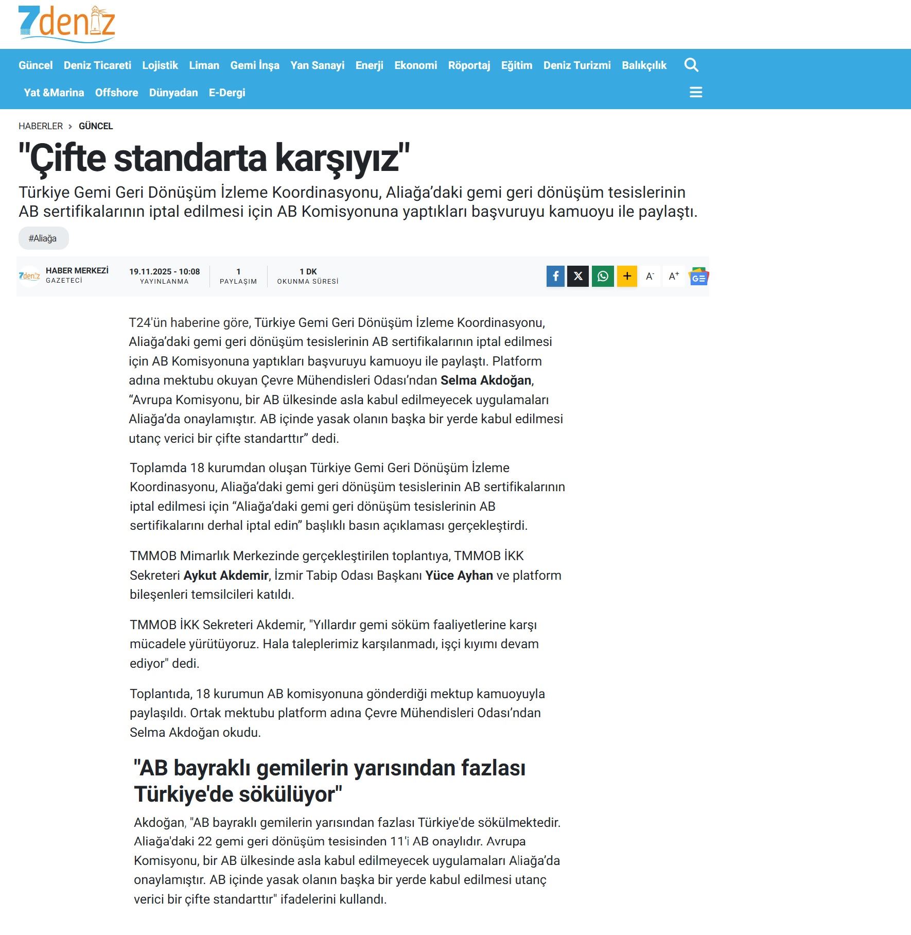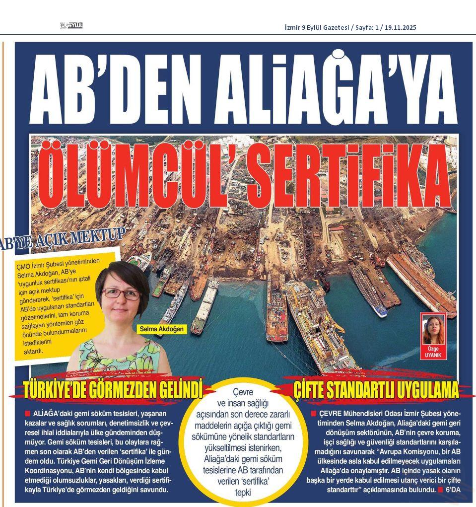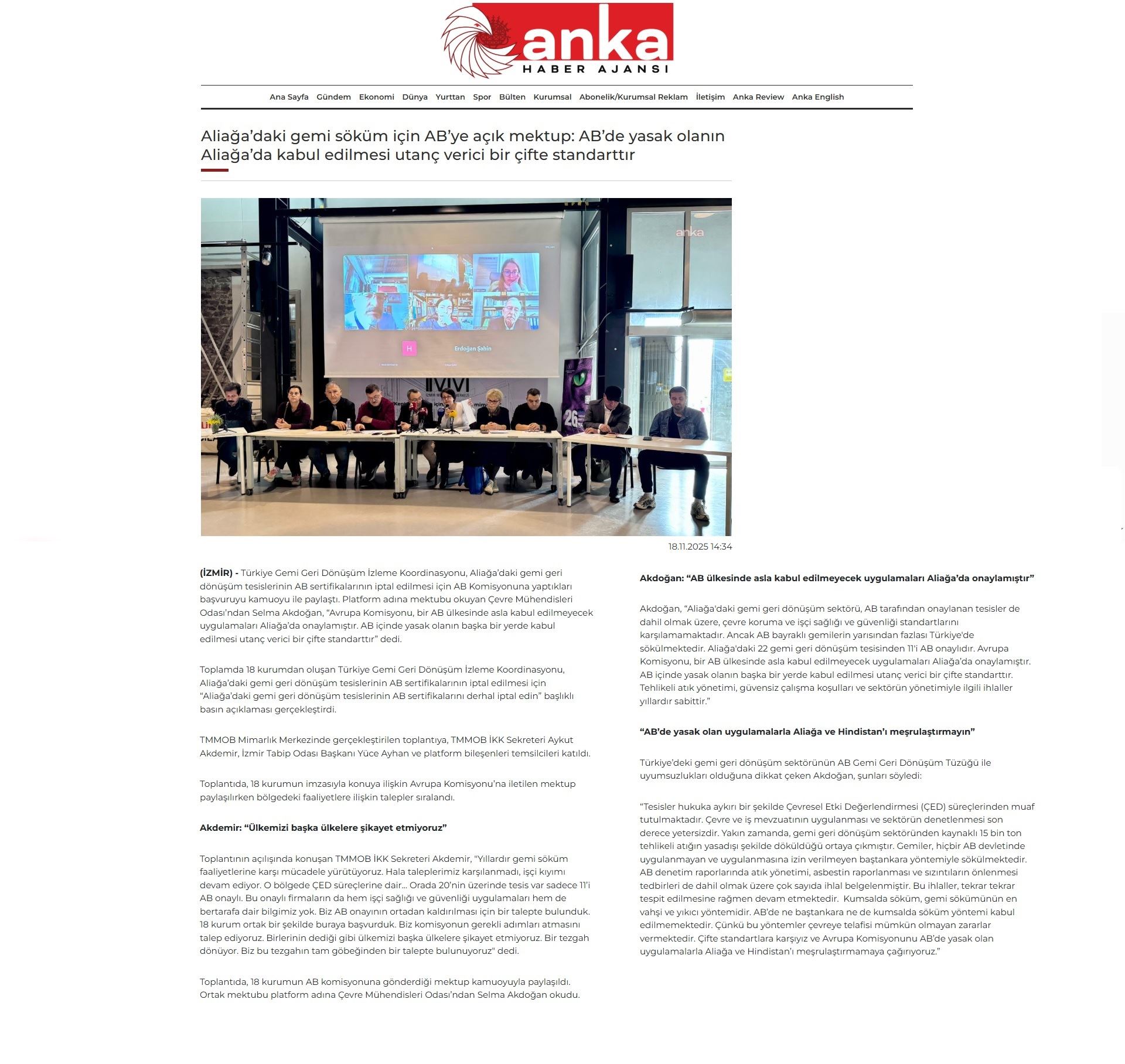 ALİAĞA’DAKİ GEMİ SÖKÜM İÇİN AB’YE AÇIK MEKTUP: AB’DE YASAK OLANIN ALİAĞA’DA KABUL EDİLMESİ UTANÇ VERİCİ BİR ÇİFTE STANDARTTIR (Anka Haber Ajansı, 18.11.2025)