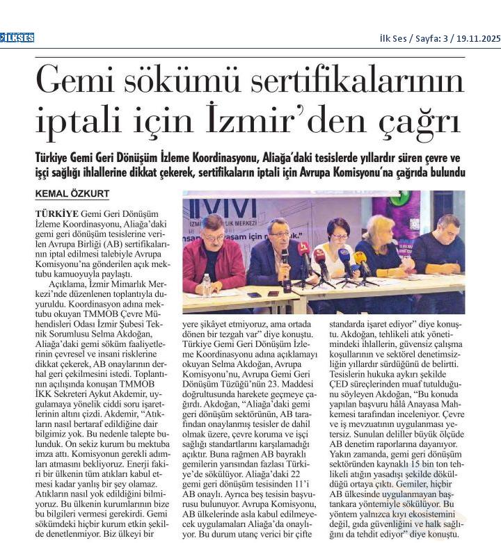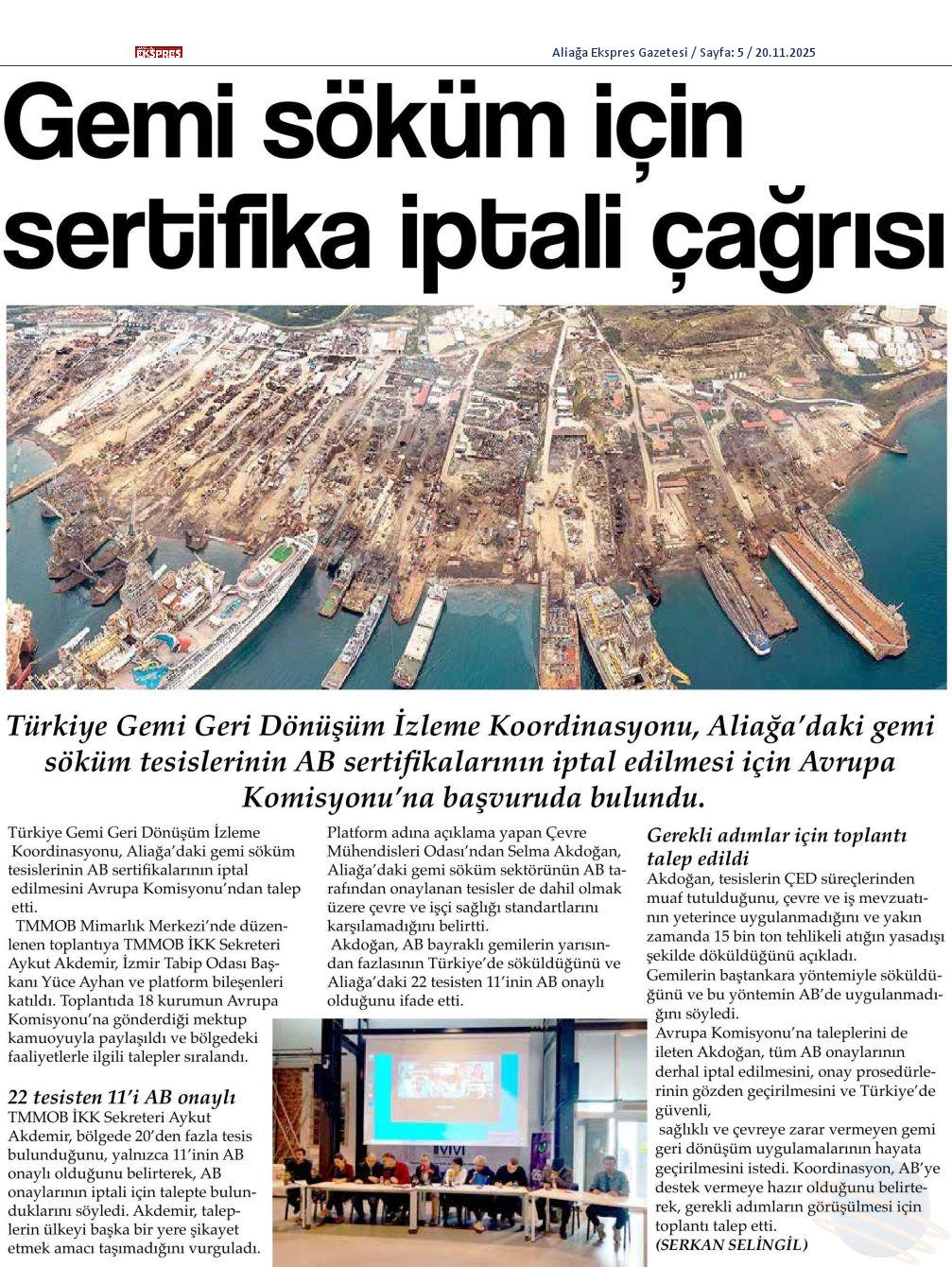 GEMİ SÖKÜM İÇİN SERTİFİKA İPTALİ ÇAĞRISI (Aliağa Ekspres Gazetesi, 20.11.2025)