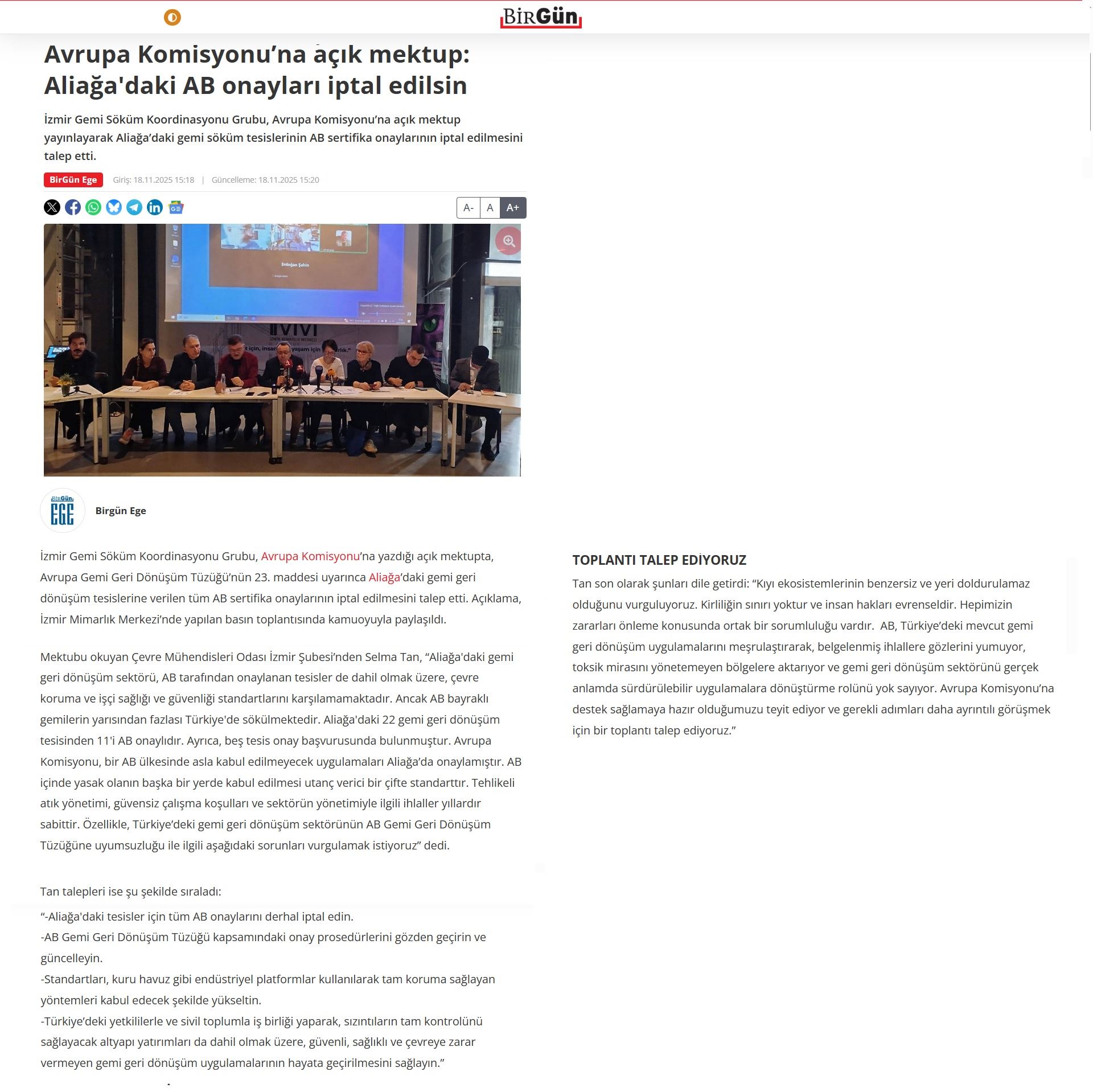 AVRUPA KOMİSYONU’NA AÇIK MEKTUP: ALİAĞA'DAKİ AB ONAYLARI İPTAL EDİLSİN (Birgün, 18.11.2025)