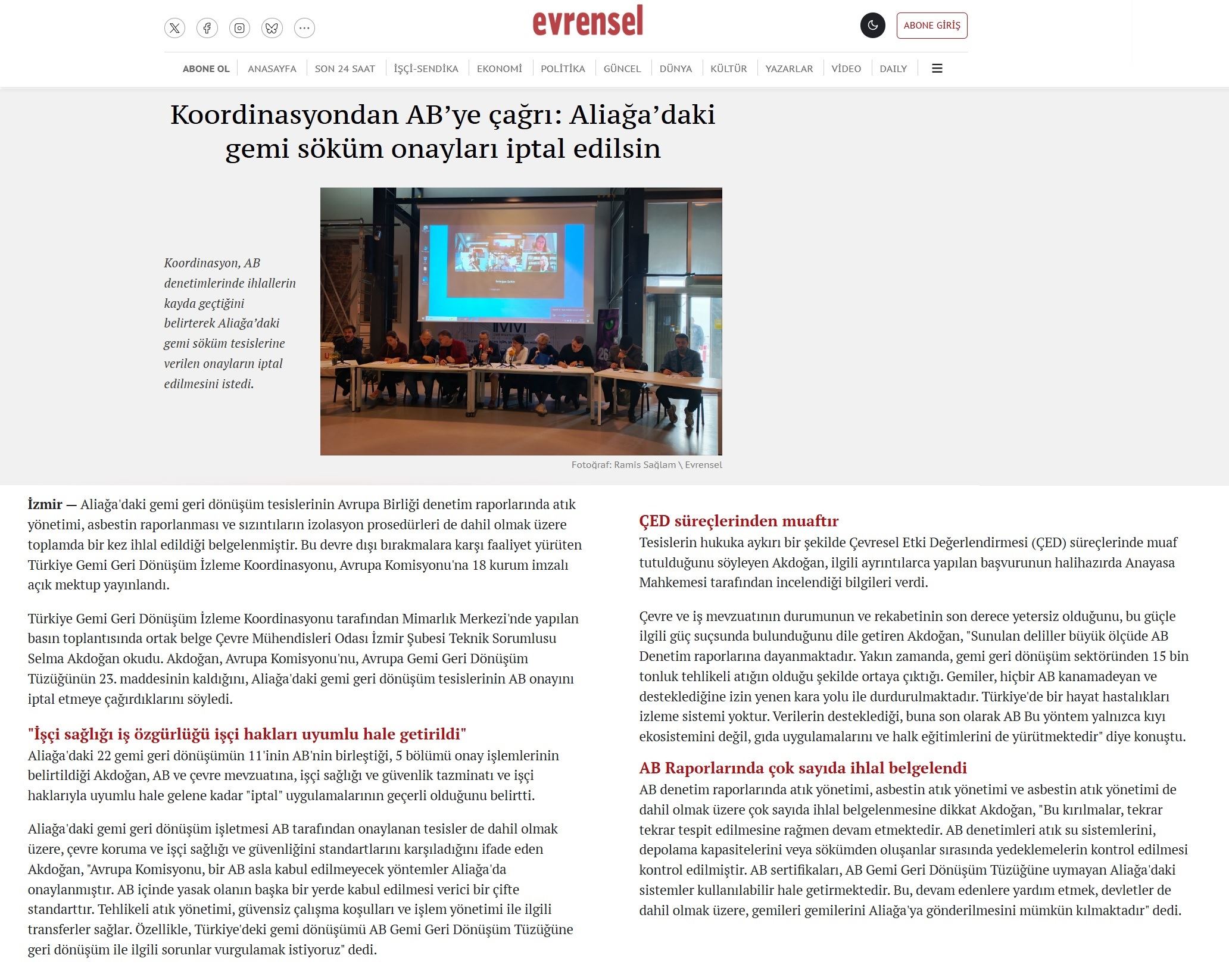 KOORDİNASYONDAN AB’YE ÇAĞRI: ALİAĞA’DAKİ GEMİ SÖKÜM ONAYLARI İPTAL EDİLSİN (Evrensel, 18.11.2025)