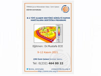 Çevre Mühendisleri Odası İzmir Şubesi olarak, 9-12 Kasım 2021 tarihleri arasında "B-2 Tipi Ulaşım Sektörü Gürültü Rapor Haritalama Sertifika Programı" Eğitimi düzenlenecektir. Eğitim içeriği ekte yer almaktadır.