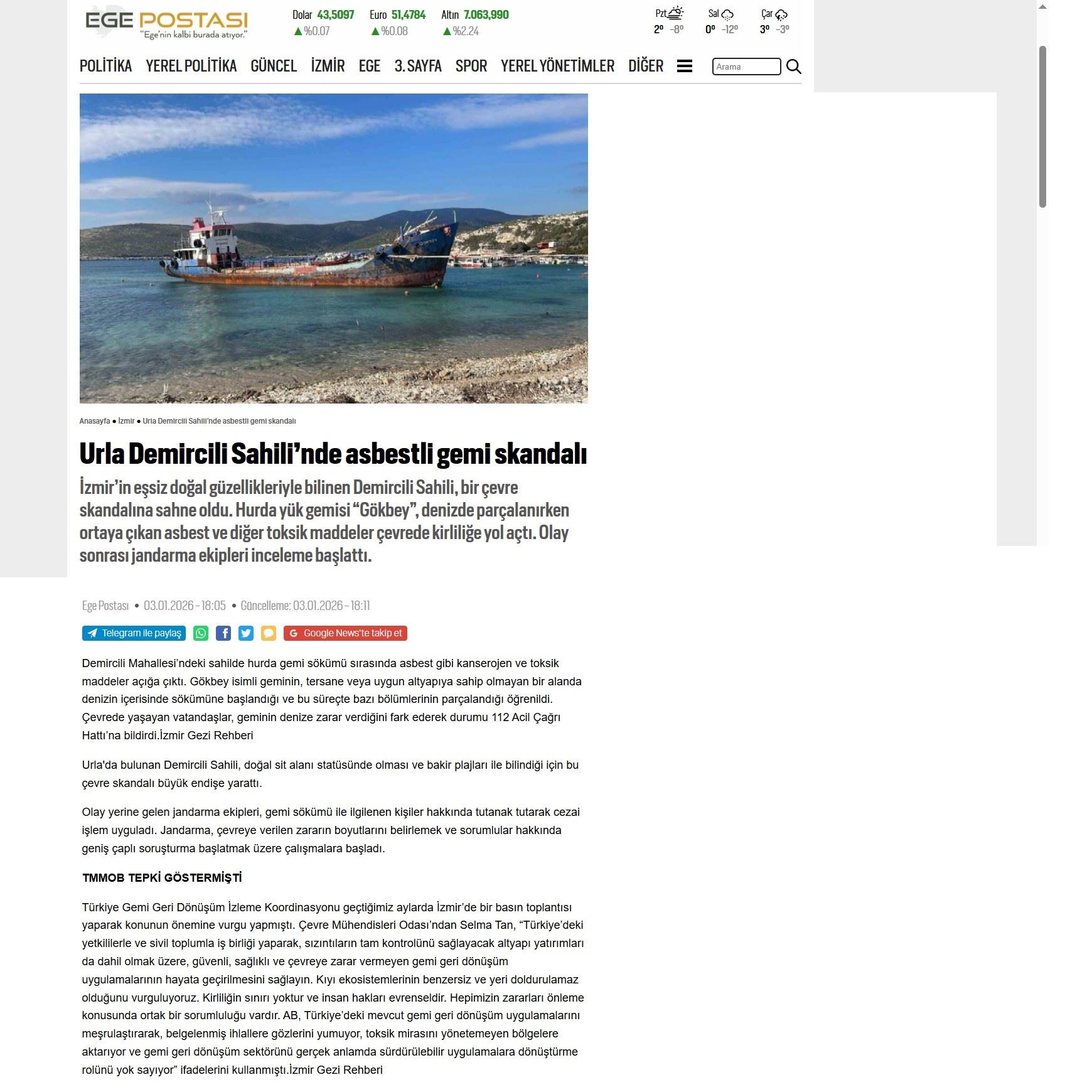 1. Urla Demircili Sahili’nde Asbestli Gemi Skandalı (Ege Postası, 03.01.2026)