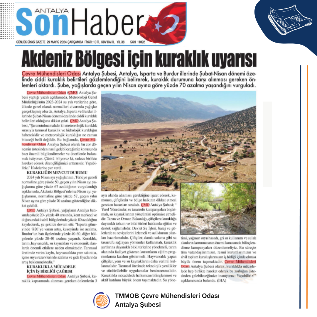 Meteoroloji Genel Müdürlüğü'nün 2023-2024 su yılı verilerine göre, ülkemizde genel olarak normalleri civarında yağışlar gerçekleşmiş olsa da, Antalya, Isparta ve Burdur illerinde Şubat-Nisan dönemi özelinde ciddi kuraklık belirtileri gözlemlenmiştir. Şu unutulmamalıdır ki: meteorolojik kuraklık sırasıyla tarımsal kuraklık ve hidrolojik kuraklığın habercisidir ve meteorolojik kuraklığın ne zaman biteceği belli değildir.