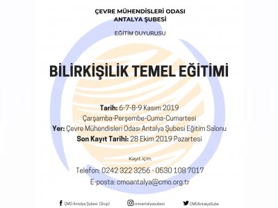 | Eğitimin Verileceği Yer ve İletişim | · TMMOB Çevre Mühendisleri Odası Antalya Şubesi Eğitim Salonu · Adres: Meltem Mahallesi Meltem Caddesi Batıkent Sitesi A Blok Kat: 2 Daire: 3 Muratpaşa/ANTALYA · Konum Bağlantısı: https://goo.gl/maps/bUL3CtrV2Hp · Telefon: 0242 322 3256 · Ofis Cep Telefonu: 0530 108 7017 · Faks: 0242 322 3258 · E-posta: cmoantalya@cmo.org.tr · İlgili kişi: Yusuf KOZ |