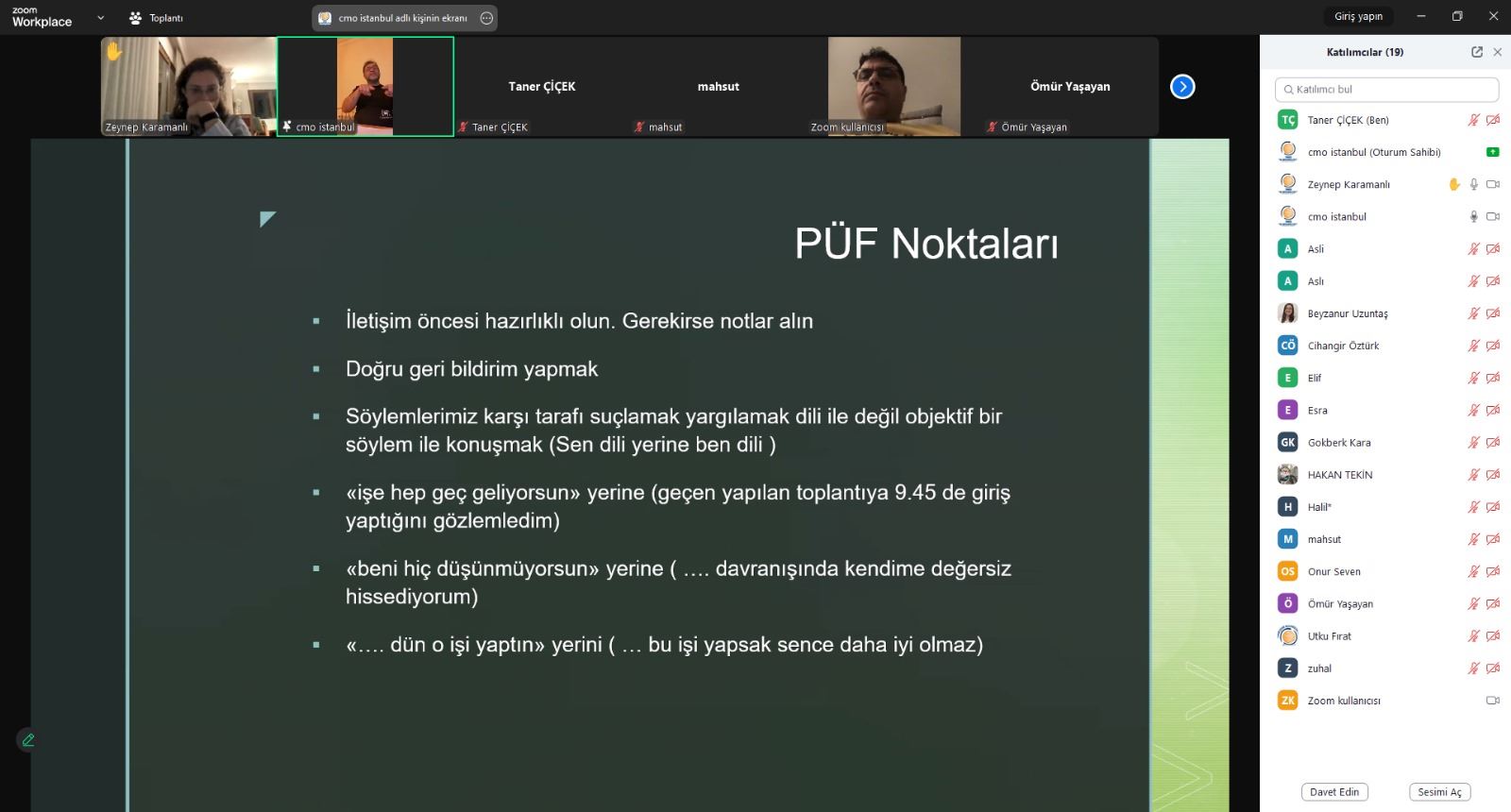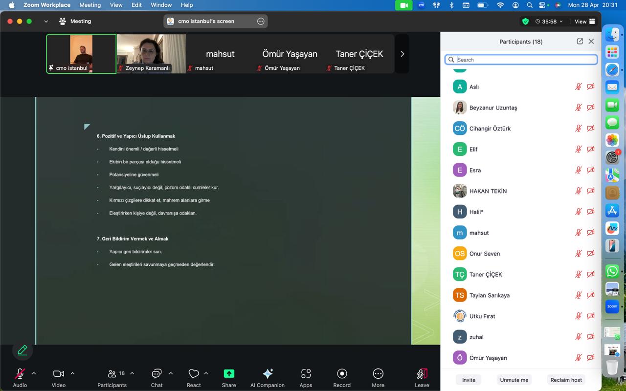 TMMOB Çevre Mühendisleri Odası İstanbul Şubesi tarafından düzenlenen çevrim içi söyleşi etkinliği, 28 Nisan 2025 Pazartesi günü saat 20.00’de gerçekleştirildi. Deprem nedeniyle ertelenen ve “Çalışma Hayatında Etkin İletişim” başlığını taşıyan etkinliğe üyelerimizin katılımı ve katkıları ile gerçekeşti.