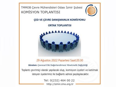 Şubemiz ÇED ve Çevre Danışmanlık Komisyonu Ortak Toplantısı; 29 Ağustos Pazartesi günü 20.30da, Çevresel Etki Değerlendirmesi Yönetmelik değişikliği gündemi ile gerçekleştirilecektir.