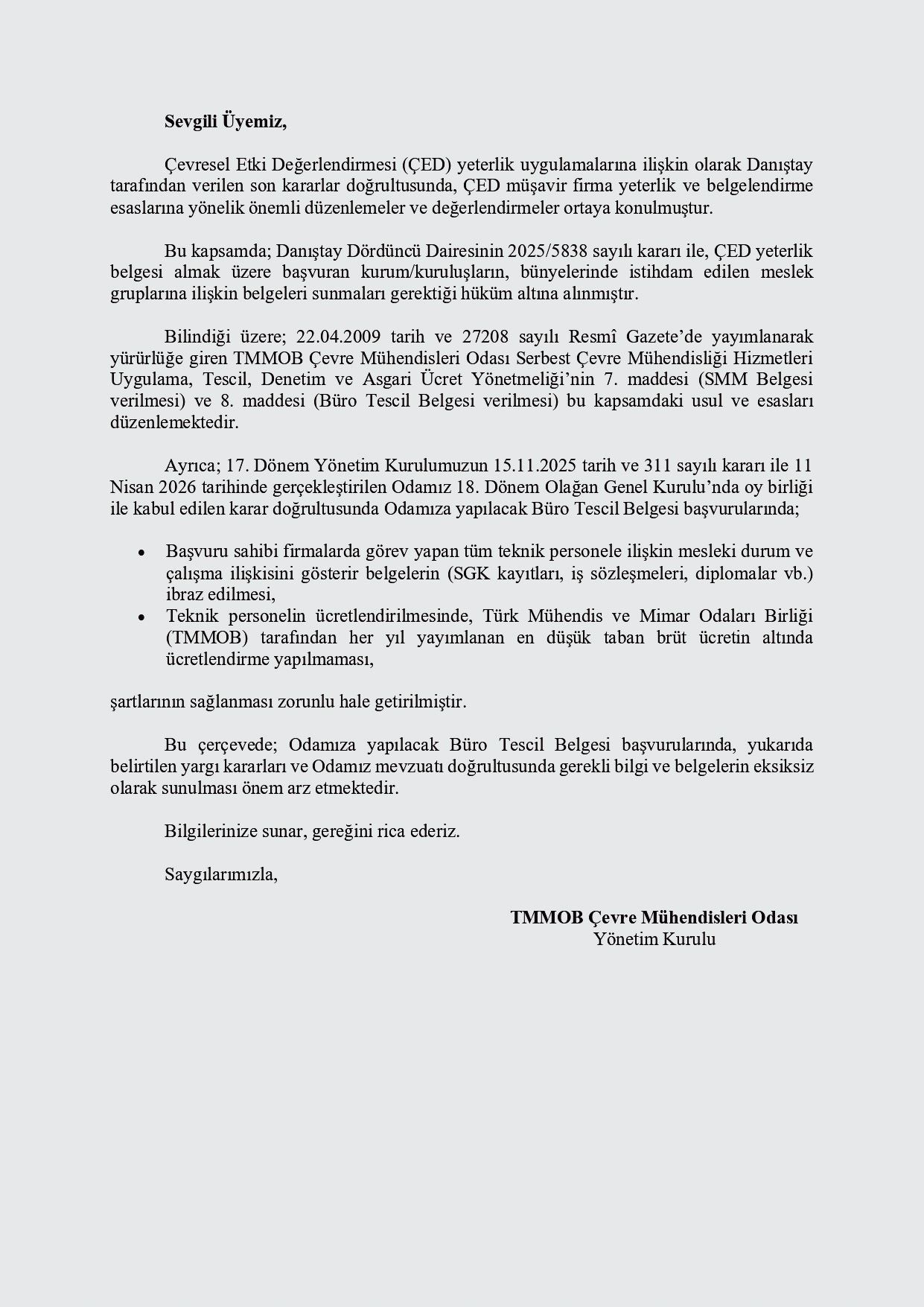 ÇED YETERLİK UYGULAMALARI VE BÜRO TESCİL BELGESİ BAŞVURULARI HAKKINDA BİLGİLENDİRME