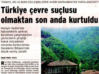 HEMŞİN Vadisi‘nde hidroelektrik santralı kurulması çalışmaları durduruldu. Mahkemenin verdiği bu kararla Türkiye, Rio ve Bern Sözleşmelerine aykırı davranmaktan uluslararası mahkemelerde çevre suçlusu olarak yargılanmaktan ve ceza almaktan kurtuldu.