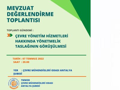 07.07.2022 tarihinde Perşembe günü Saat 20:00`de Çevre Mühendisleri Odası Antalya Şubesinde Üyelerimizin görüş ve önerilerini almak üzere Mevzuatlar ve Ruhsatlandırma Komisyonu tarafından toplantı düzenlenmiştir. T.C. Çevre, Şehircilik ve İklim Değişikliği Bakanlığı tarafından yayınlanan "Çevre Yönetim Hizmetleri Hakkında Yönetmelik Taslağa ilişkin görüş ve öneriler belirlenerek söz konusu yönetmelik taslak Odamızca Bakanlığa iletilmiştir.
