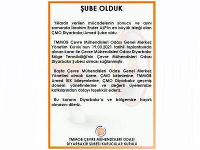 TMMOB Çevre Mühendisleri Odası Genel Merkez Yönetim Kurulu‘nun 19.03.2021 tarihli toplantısında alınan karar ile Çevre Mühendisleri Odası Diyarbakır Bölge Temsilciliği‘nin Çevre Mühendisleri Odası Diyarbakır Şubesi olması sağlanmıştır.