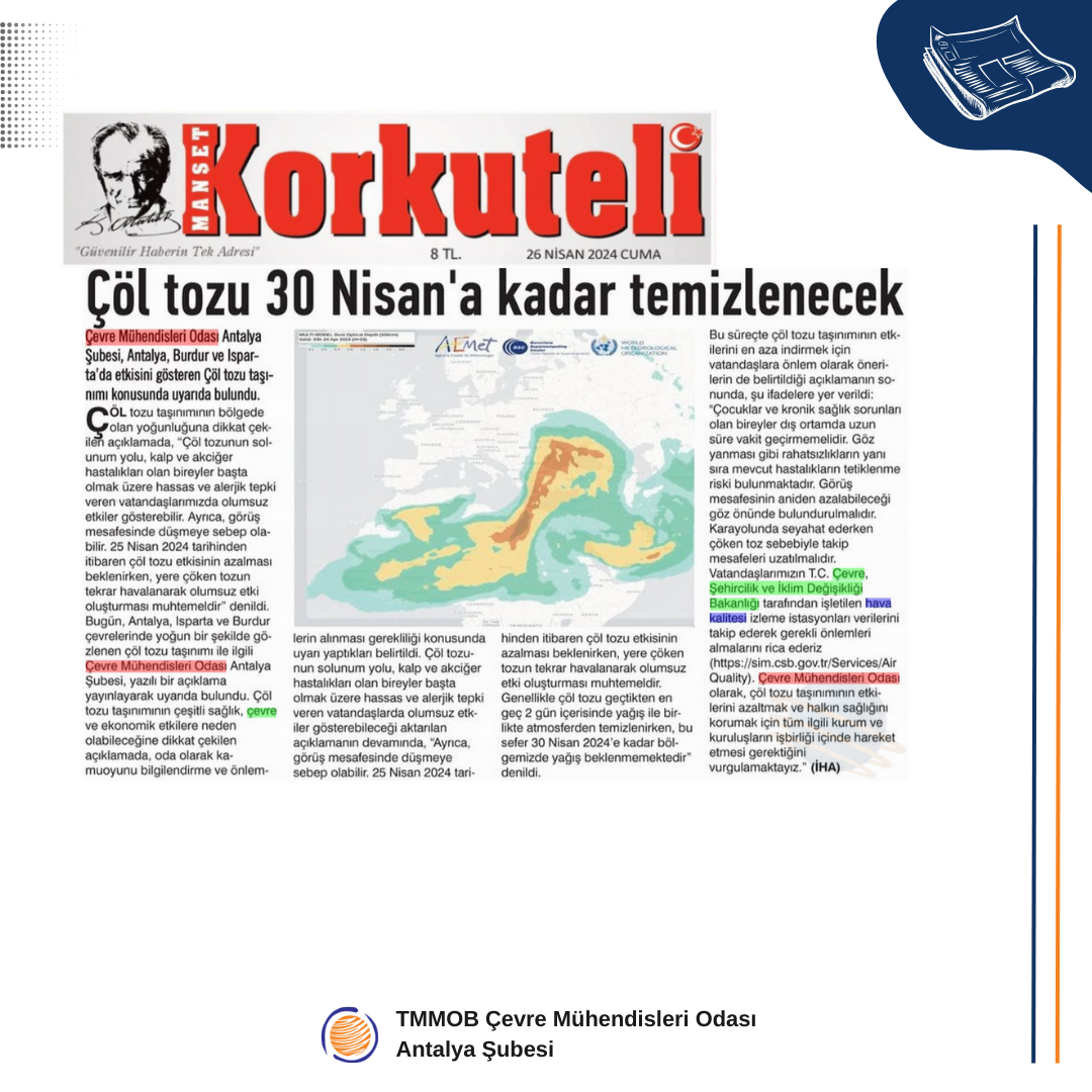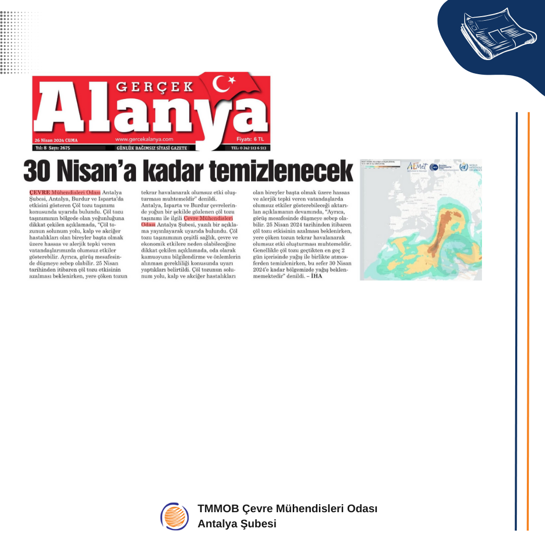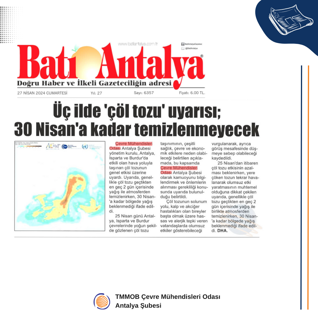 25 Nisan 2024 tarihinde, Antalya, Isparta ve Burdur çevrelerinde yoğun bir şekilde gözlenen çöl tozu taşınımı, çeşitli sağlık, çevre ve ekonomik etkilere neden olabilir (Ek 1). Bu kapsamda, Çevre Mühendisleri Odası Antalya Şubesi olarak kamuoyunu bilgilendirmek ve önlemlerin alınması gerekliliği konusunda uyarıda bulunuyoruz.
