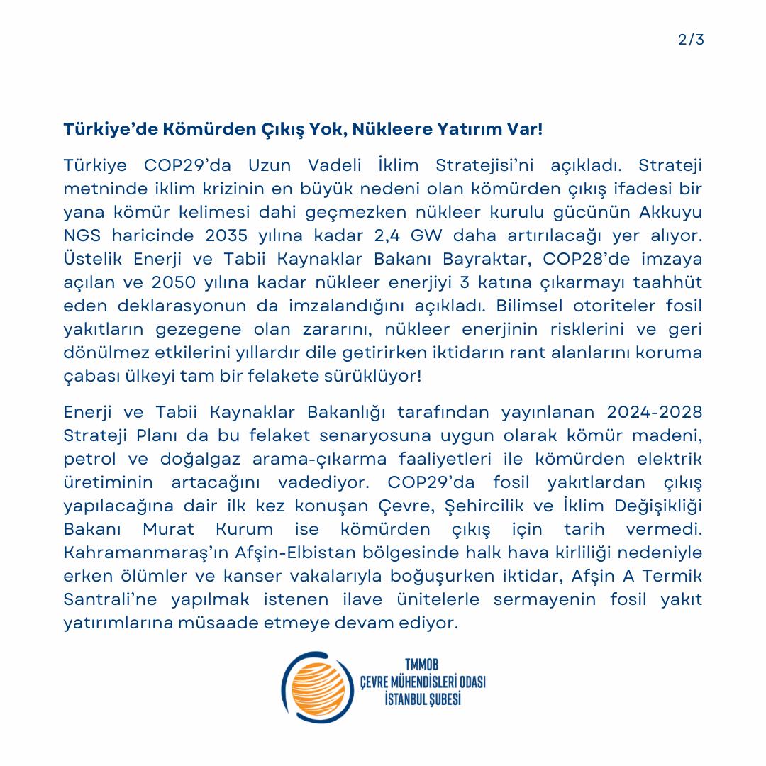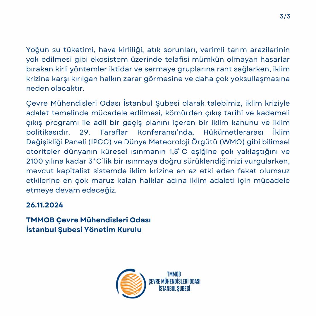 Çevre Mühendisleri Odası İstanbul Şubesi olarak talebimiz, iklim kriziyle adalet temelinde mücadele edilmesi, kömürden çıkış tarihi ve kademeli çıkış programı ile adil bir geçiş planını içeren bir iklim kanunu ve iklim politikasıdır. 29. Taraflar Konferansı’nda Hükümetlerarası İklim Değişikliği Paneli (IPCC) ve Dünya Meteoroloji Örgütü (WMO) gibi bilimsel otoriteler dünyanın küresel ısınmanın 1,5oC eşiğine çok yaklaştığını ve 2100 yılına kadar 3oC’lik bir ısınmaya doğru sürüklendiğimizi vurgularken, mevcut kapitalist sistemde iklim krizine en az etki eden fakat olumsuz etkilerine en çok maruz kalan halklar adına iklim adaleti için mücadele etmeye devam edeceğiz.