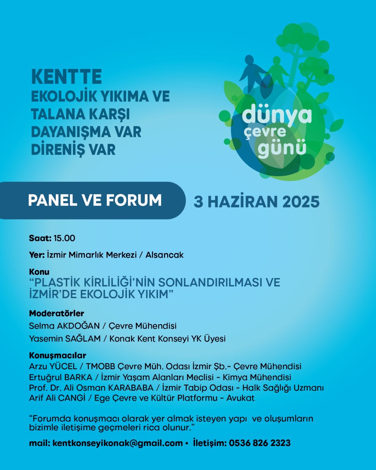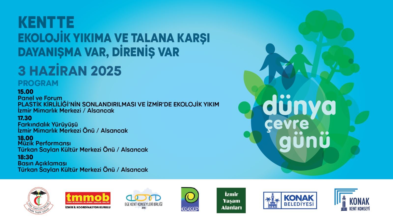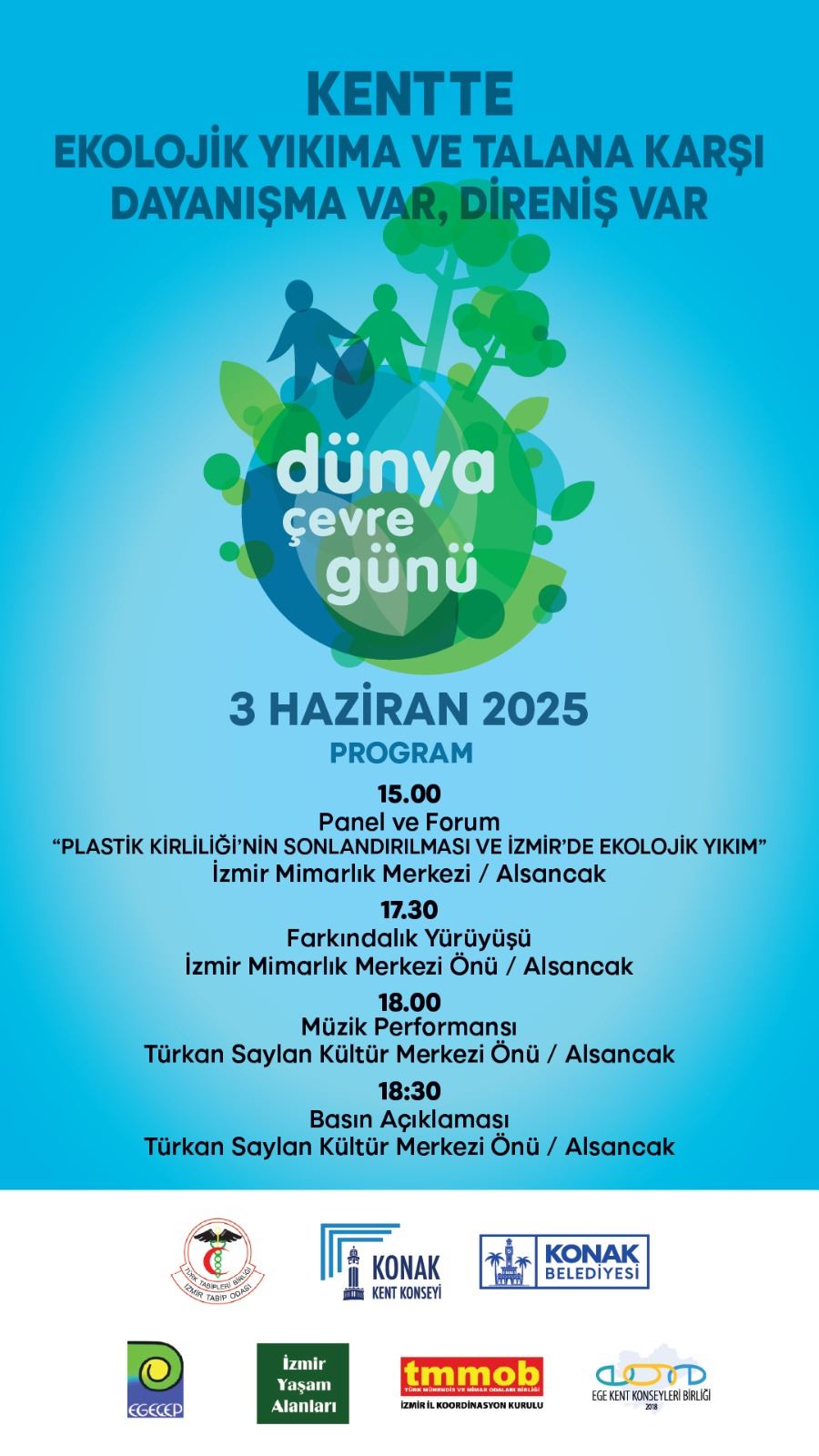 Ekolojik Yıkımla Mücadele Haftası ve Dünya Çevre Günü kapsamında 3 Haziran 2025 tarihinde “Kentte Ekolojik Yıkıma Karşı Direniş ve Dayanışma Devam Ediyor” teması ile her yıl TMMOB İzmir İl Koordinasyon Kurulu, Konak Belediyesi, Konak Kent Konseyi, İzmir Tabip Odası, Ege Kent Konseyleri Birliği, Egeçep ve İzmir Yaşam Alanları olarak düzenlediğimiz ortak etkinliklerimiz bu yıl “Gezegeni Plastik Kirliliğinden Kurtarmak” konusuyla gerçekleştirilecektir. Etkinlik programı ektedir. Bilgilerinize sunar, katılımızı dileriz.