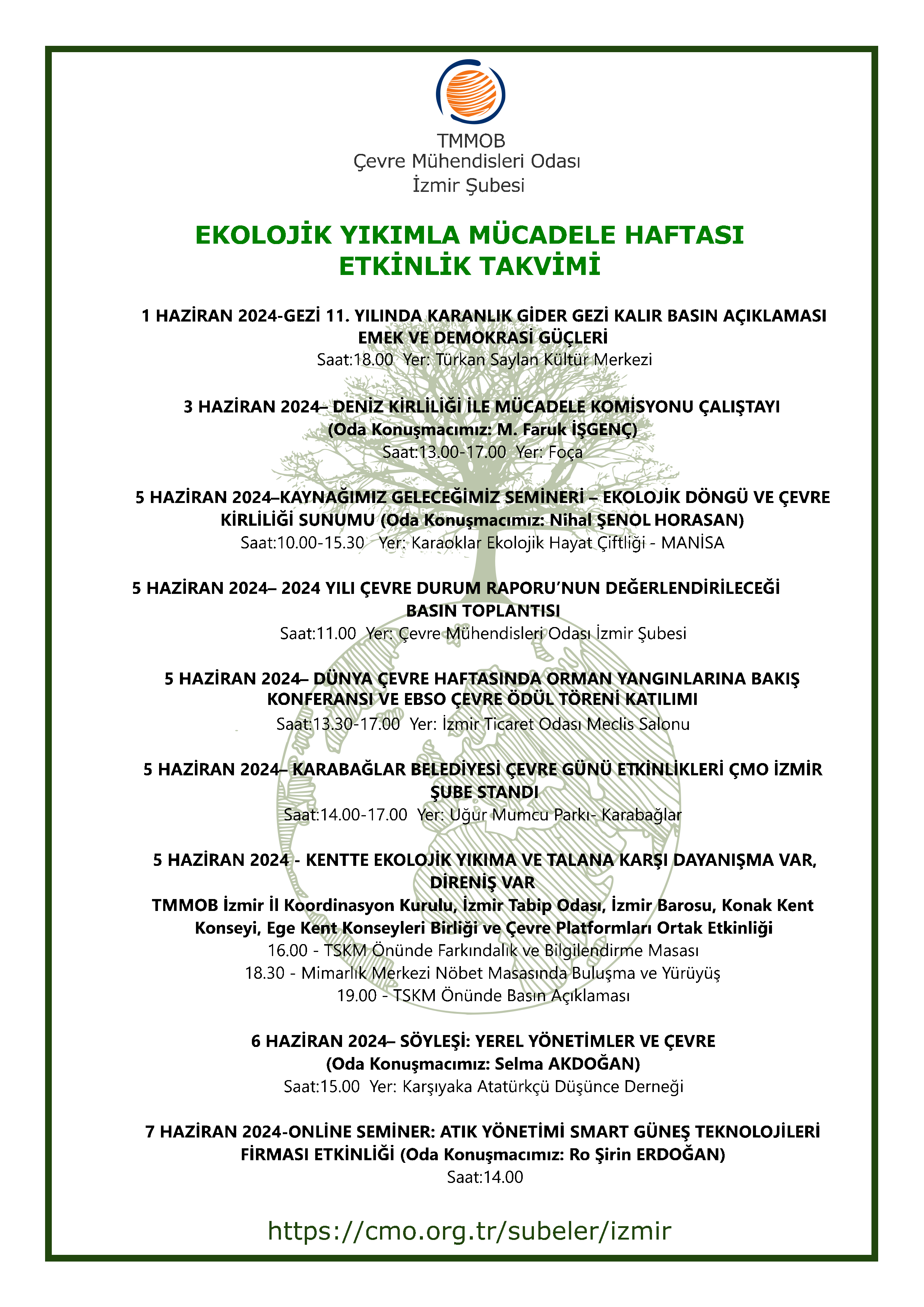Bu süreçte gerçekleştireceğimiz etkinliklerle her yıl olduğu gibi bu yıl da kamuoyunu ekoloji sorunlarıyla ilgili bilgilendirmek, farkındalık yaratmak ve mücadelemizi büyütmek için çalışacağız.