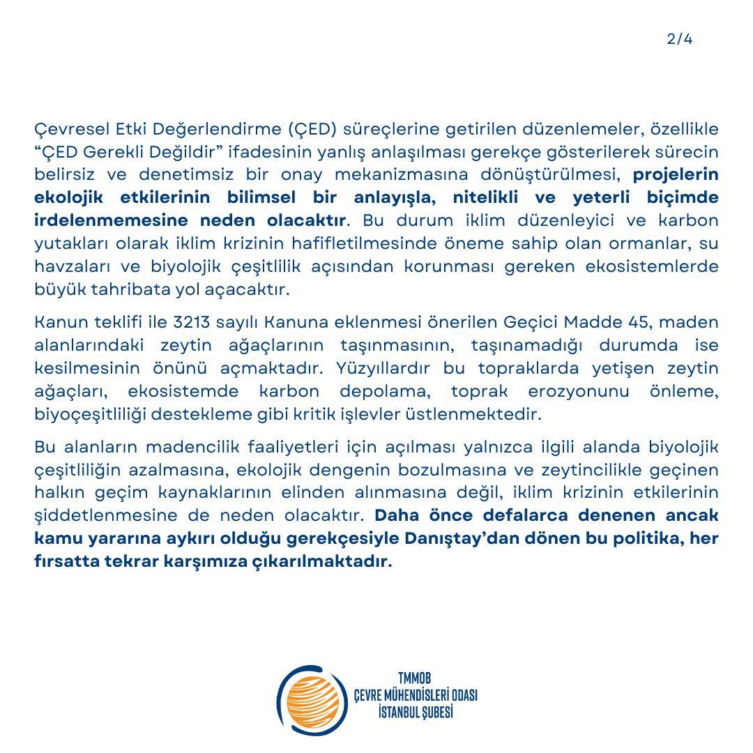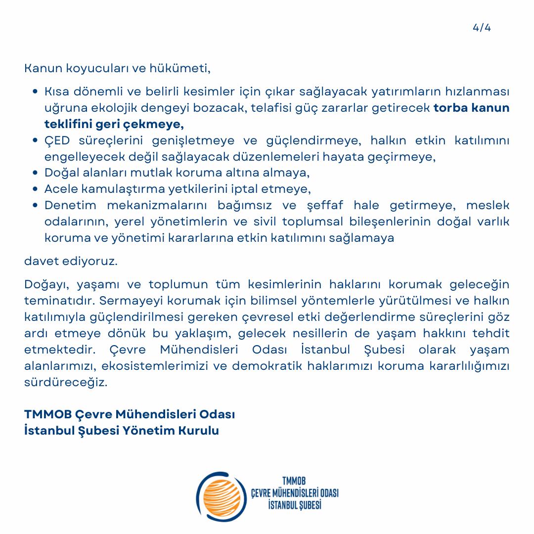 Doğayı, yaşamı ve toplumun tüm kesimlerinin haklarını korumak geleceğin teminatıdır. Sermayeyi korumak için bilimsel yöntemlerle yürütülmesi ve halkın katılımıyla güçlendirilmesi gereken çevresel etki değerlendirme süreçlerini göz ardı etmeye dönük bu yaklaşım, gelecek nesillerin de yaşam hakkını tehdit etmektedir. Çevre Mühendisleri Odası İstanbul Şubesi olarak yaşam alanlarımızı, ekosistemlerimizi ve demokratik haklarımızı koruma kararlılığımızı sürdüreceğiz.