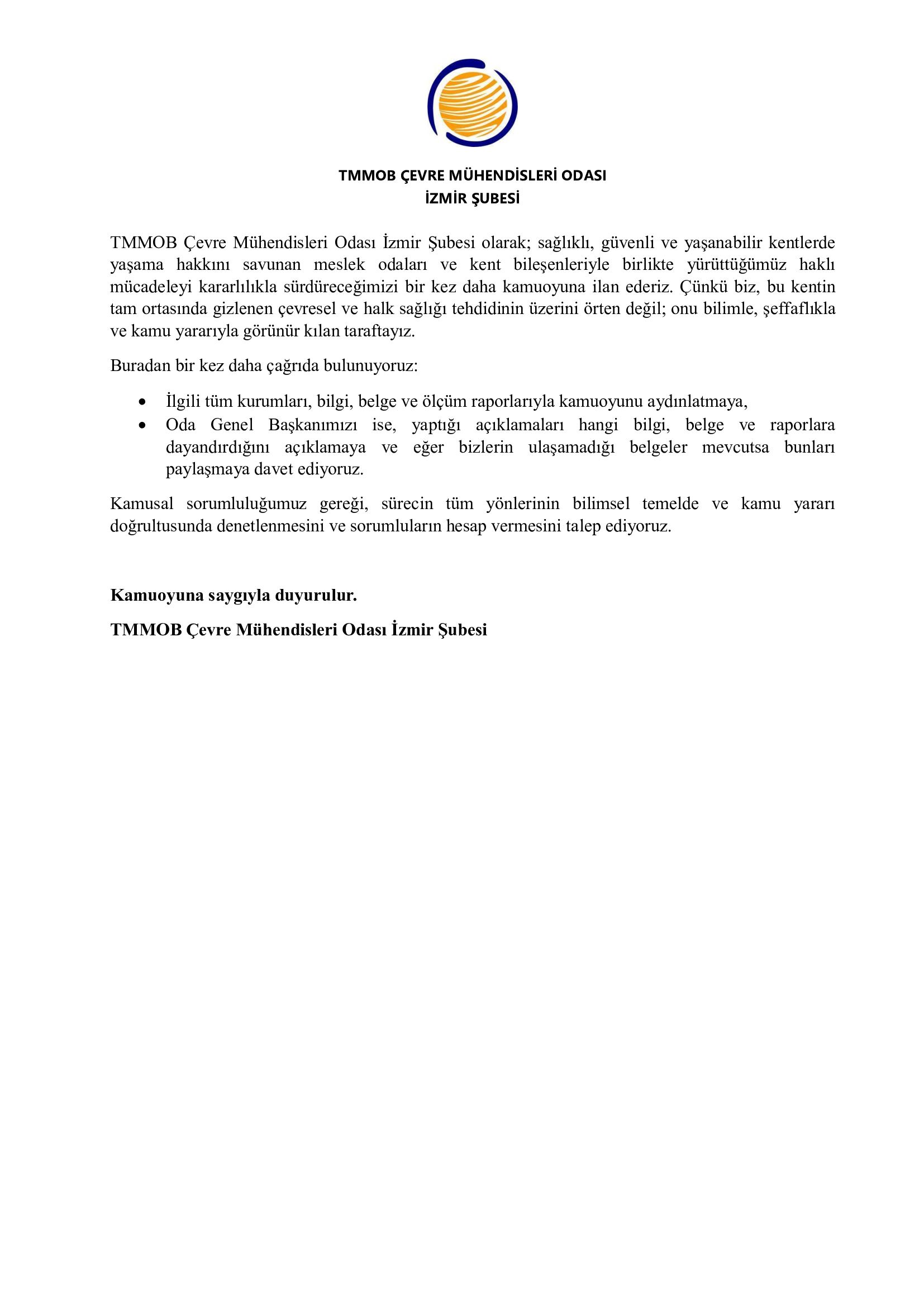 TMMOB Çevre Mühendisleri Odası İzmir Şubesi olarak; sağlıklı, güvenli ve yaşanabilir kentlerde yaşama hakkını savunan meslek odaları ve kent bileşenleriyle birlikte yürüttüğümüz haklı mücadeleyi kararlılıkla sürdüreceğimizi bir kez daha kamuoyuna ilan ederiz. Çünkü biz, bu kentin tam ortasında gizlenen çevresel ve halk sağlığı tehdidinin üzerini örten değil; onu bilimle, şeffaflıkla ve kamu yararıyla görünür kılan taraftayız.