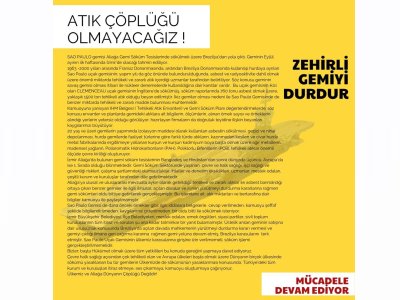 Açıklamanın üzerinden 7 gün geçmiştir. İlgili ulusal uluslararası mevzuata aykırı olarak, eksik yanlış beyanlarla, Brezilya`daki mahkeme kararlarına ve yapılan açıklamaya rağmen, zehirli gemi yolculuğunu durdurmamış, hala yoluna devam etmektedir.