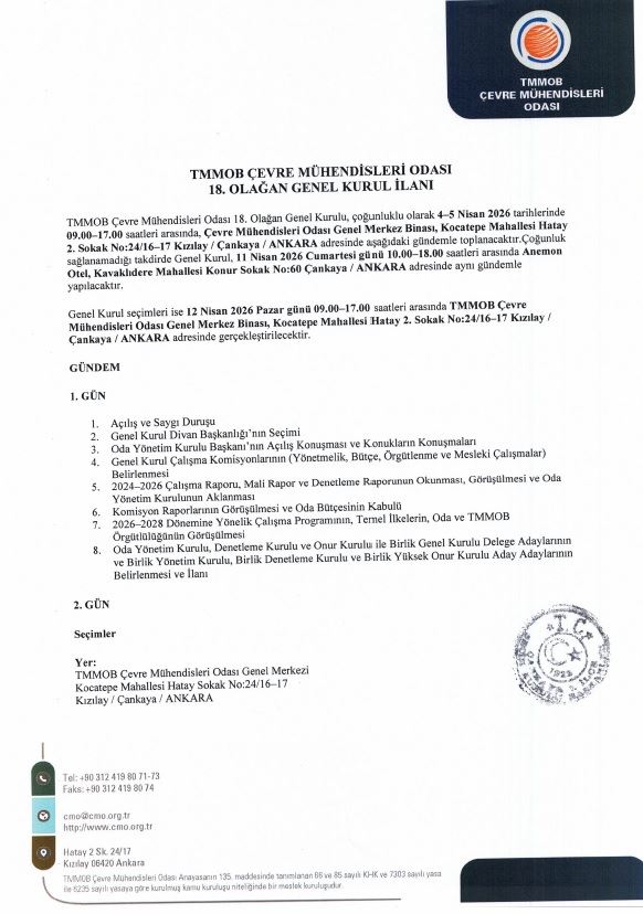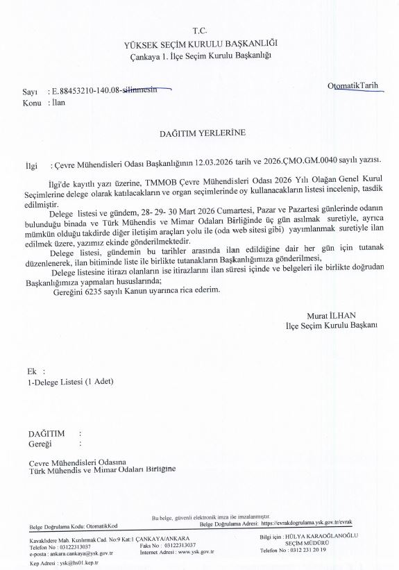 TMMOB Çevre Mühendisleri Odası 18. Olağan Genel Kurulu’nda oy kullanacak delege listesi, T.C. Yüksek Seçim Kurulu Başkanlığı Çankaya 1. İlçe Seçim Kurulu Başkanlığı tarafından onaylanmıştır.