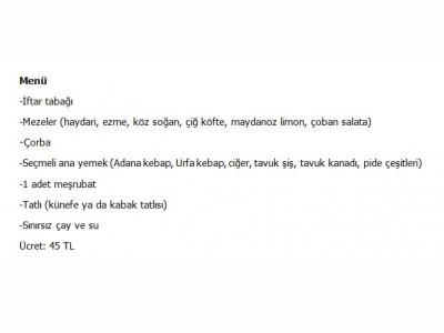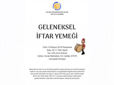 Çevre Mühendisleri Odası Antalya Şubesi olarak birlik ve beraberliğimizi pekiştirmek adına 23 Mayıs 2019 Perşembe günü gerçekleşecek olan iftar yemeğine tüm üyelerimiz davetlidir. Mekanda yer sorunu ve hizmette gecikme yaşanmaması için katılmak isteyen kişilerin; kaç kişi olarak katılacaklarını ve görseldeki bilgilendirme dahilinde ana yemek tercihlerini en geç 21 Mayıs 2019 Salı günü saat 16:00‘ya kadar 0242 322 3256-0530 108 7017 numaralı telefonlardan (Yusuf KOZ) bildirmeleri gerekmektedir. Ödemeler etkinlik akşamı mekanda alınacaktır.
