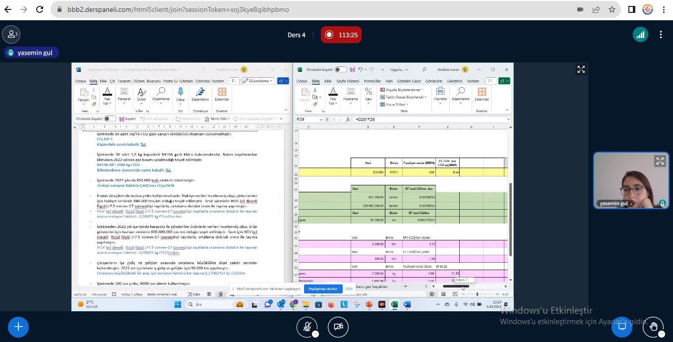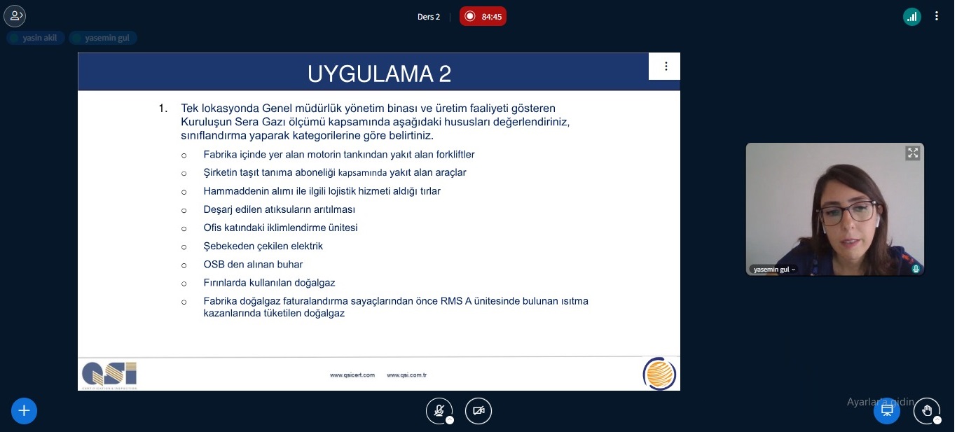 Meslektaşımız Yasemin BURAN GÜL’ün eğitmen olduğu eğitimin içeriğinde Standarda Giriş, Operasyonel Sınırların Belirlenmesi, Örnek Alıştırmalar, Raporlama Sınırlarının Belirlenmesi,, Kategori 1 Doğrudan Emisyonlar, Kategori 2 İthal Edilen Enerji Kaynaklı Emisyonlar, Kategori 3 Ulaşım Kaynaklı Dolaylı Emisyonlar, Kategori 4 Kullanılan Ürün/Hizmet Kaynaklı Dolaylı Emisyonlar, Kategori 5 Ürünlerin Kullanımıyla İlişkili Dolaylı Emisyonlar, Kategori 6 Diğer Dolaylı Emisyonlar, Küresel Isınma Potansiyeli, Hesaplama Faktörleri, Uzaklaştırma Faktörleri, IPCC, DEFRA, EPA Veri tabanlarının incelenmesi, Sera Gazı Emisyon Raporu içeriği, Sera Gazı Kalite Yönetim Sistemi, Belirsizlik Analizi, her bir kategori için Excel uygulamalı hesaplamaları ile soru ve cevaplar olup oldukça verimli bir eğitim gerçekleştirildi.