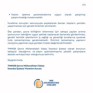 TMMOB Çevre Mühendisleri Odası İstanbul Şubesi olarak konunun takipçisi olacağımızı ve olayın aydınlatılmasına yönelik çalışmalara destek vermeye hazır olduğumuzu belirtiriz.