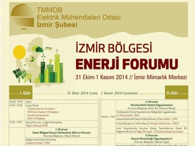 Elektrik Mühendisleri Odası İzmir Şubesi sekreteryasında; Çevre Mühendisleri Odası İzmir Şb., Mimarlar Odası İzmir Şb.,Şehir Plancıları Odası İzmir Şb. ile EBSO, İzmir Barosu, TEİAŞ, Gediz EDAŞ, DSİ II. Bölge Müdürlüğü destekleriyle 31 Ekim-1 Kasım 2014 tarihlerinde İzmir Bölgesi Enerji Forumu gerçekleştirilecektir.