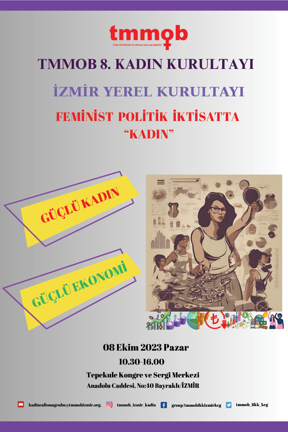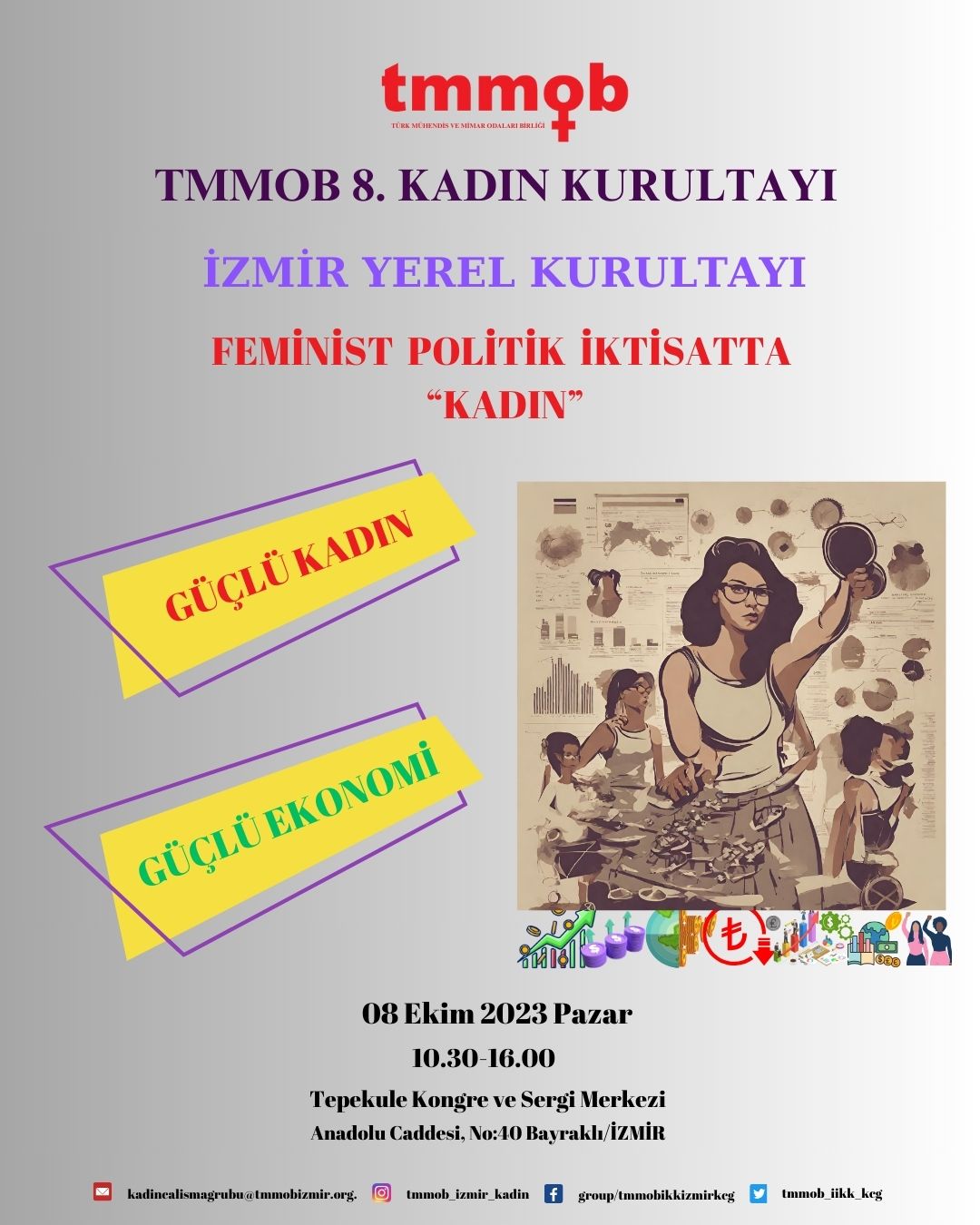 TMMOB İzmir İl Koordinasyon Kurulu Kadın Çalışma Grubu tarafından “Güçlü Kadın, Güçlü Ekonomi“ teması ile İzmir Yerel Kadın Kurultayı 8 Ekim 2023 Pazar günü Tepekule Kongre ve Sergi Merkezi’nde gerçekleştirilecektir. Etkinlik programı ekte yer almaktadır.