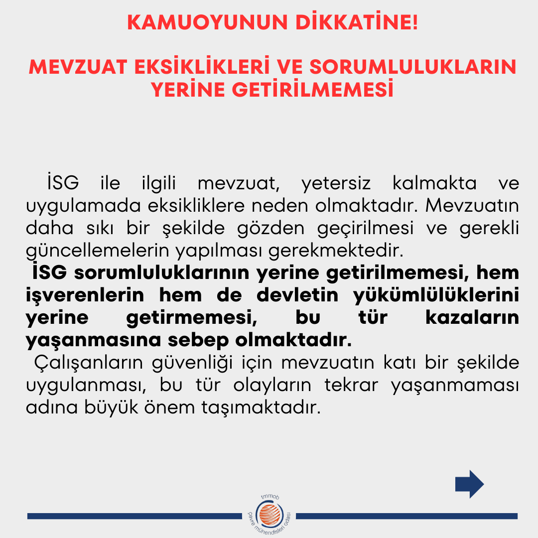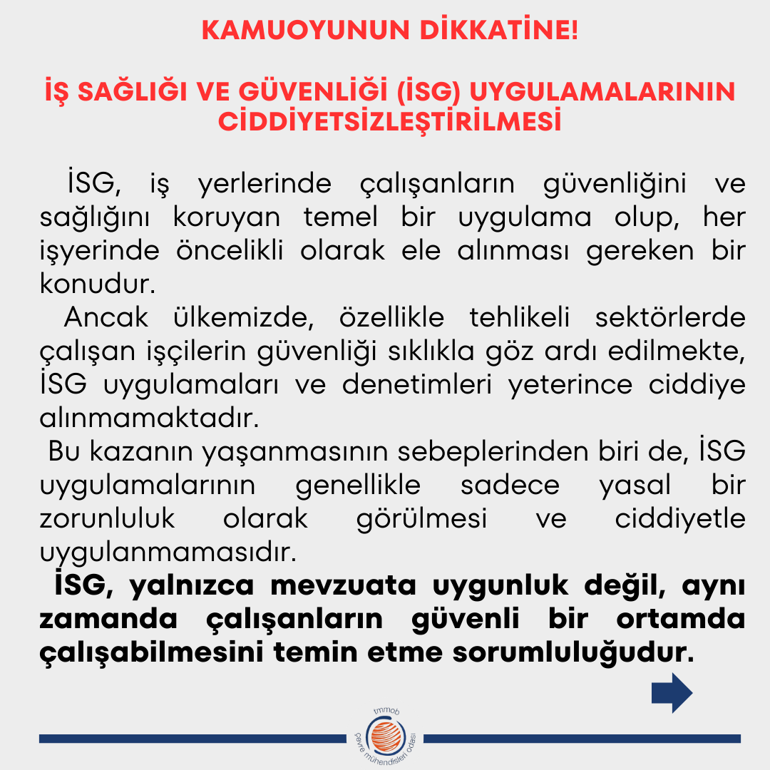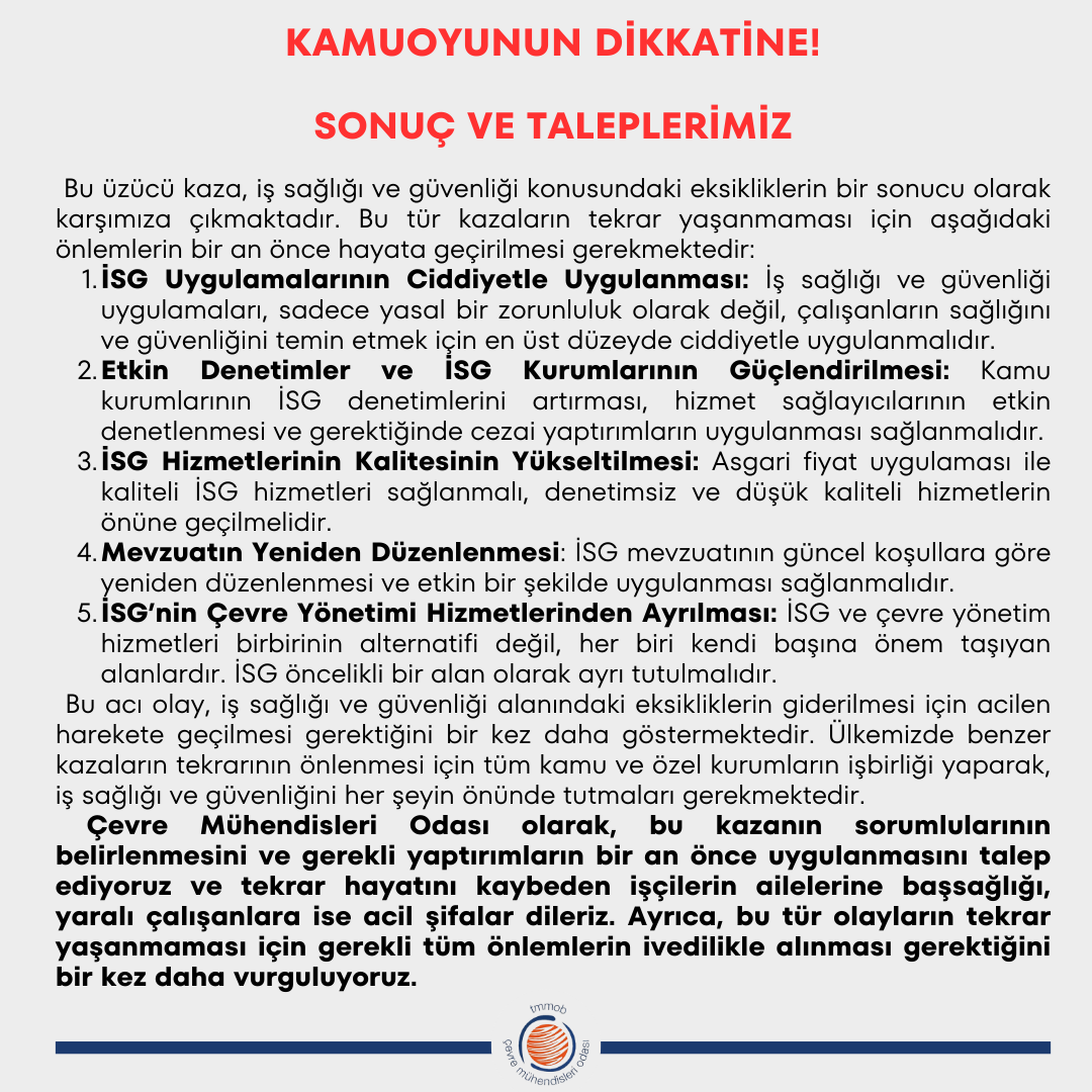 Bu acı olay, ülkemizde iş sağlığı ve güvenliği (İSG) konusunda yaşanan çok ciddi ihlallerin ve ihmallerin bir yansımasıdır. İSG uygulamalarının önemsizleşmesi, denetim eksiklikleri, İSG hizmetlerinin kalitesizleşmesi ve denetimsizlik gibi sorunlar, bu tür kazaların artmasına yol açmaktadır. Çevre mühendisleri olarak, yaşanan kazayı bir uyarı olarak görmekte ve ülke genelinde benzer trajedilerin yaşanmaması adına gereken tüm önlemlerin bir an önce alınmasını talep ediyoruz.