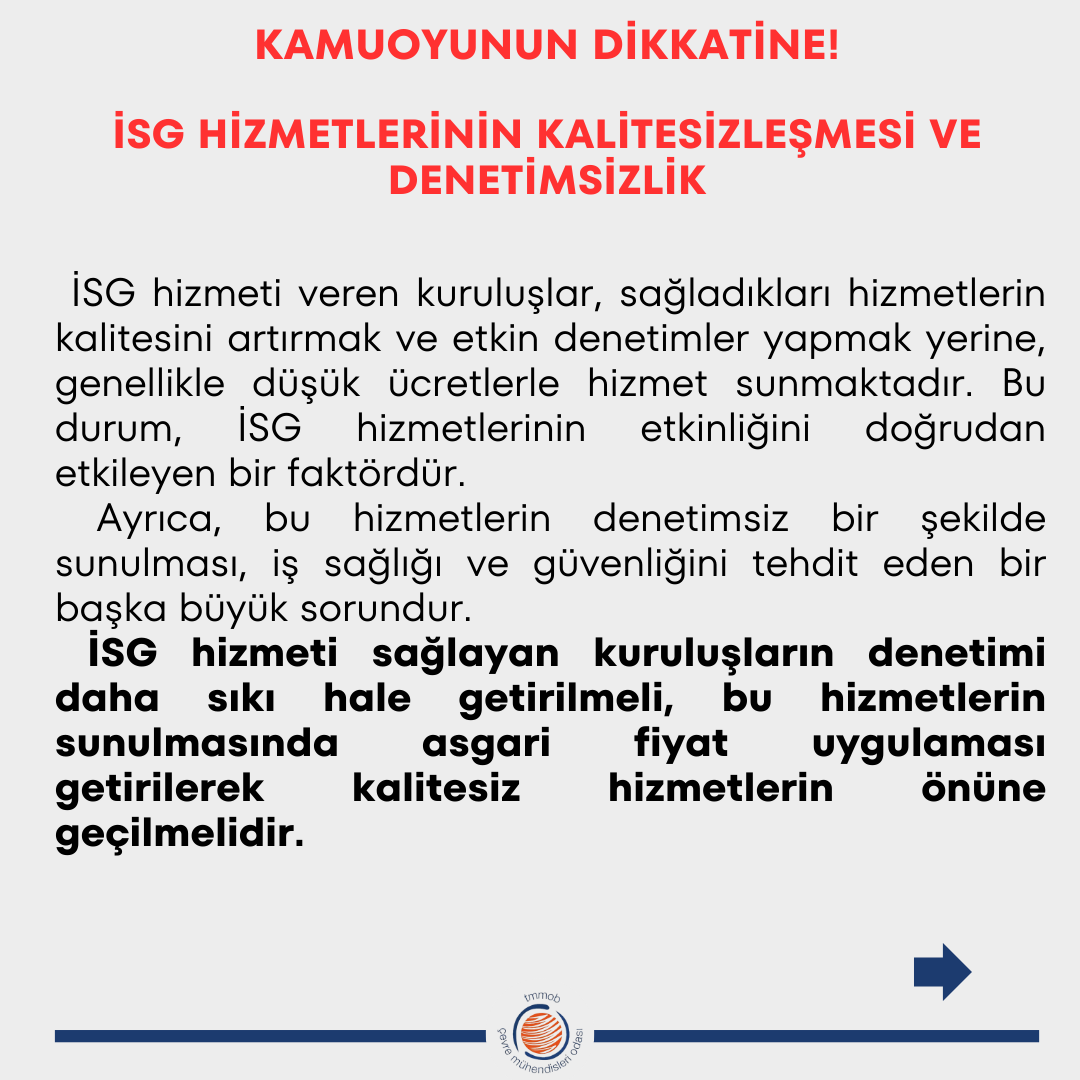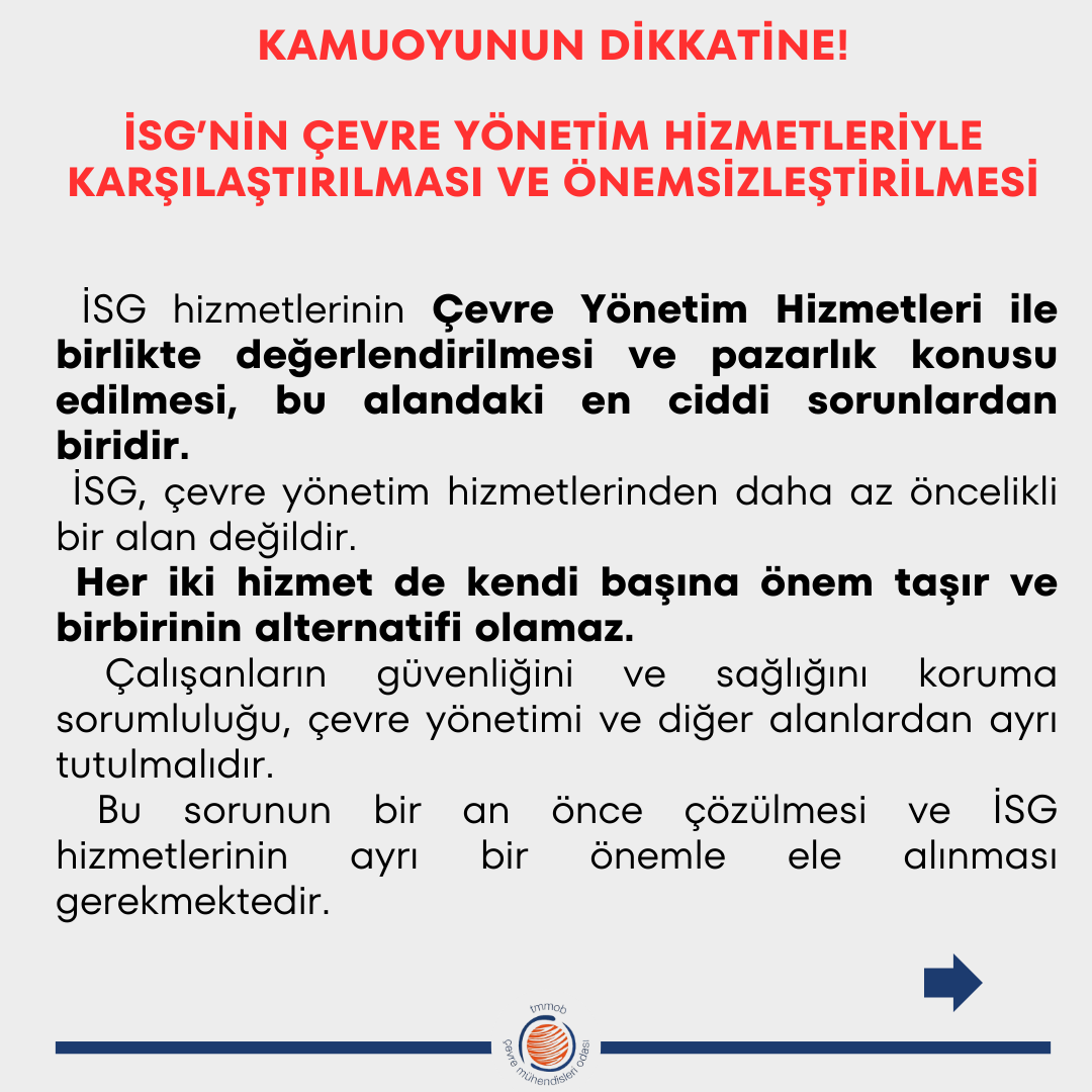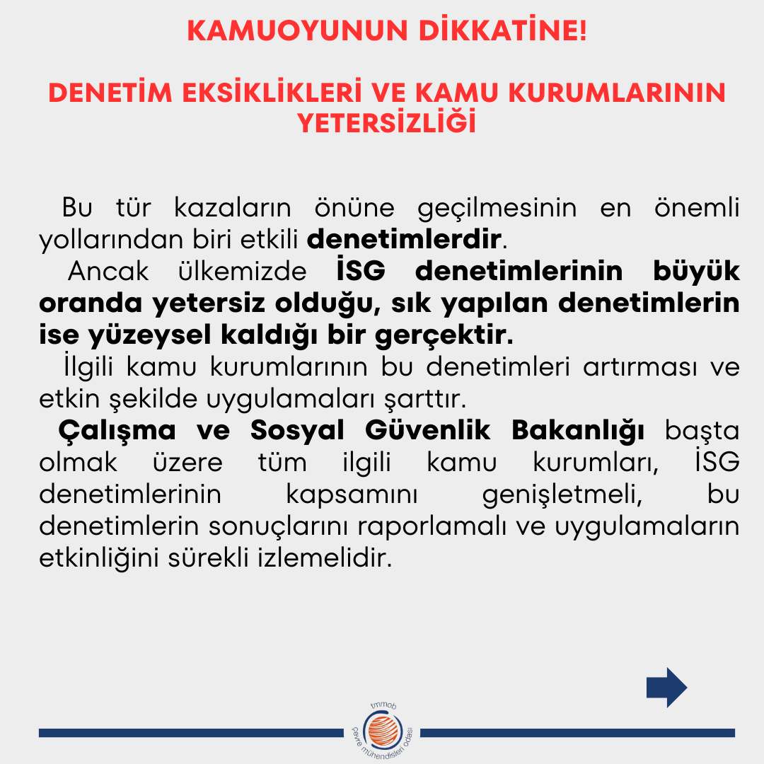 Bu acı olay, ülkemizde iş sağlığı ve güvenliği (İSG) konusunda yaşanan çok ciddi ihlallerin ve ihmallerin bir yansımasıdır. İSG uygulamalarının önemsizleşmesi, denetim eksiklikleri, İSG hizmetlerinin kalitesizleşmesi ve denetimsizlik gibi sorunlar, bu tür kazaların artmasına yol açmaktadır. Çevre mühendisleri olarak, yaşanan kazayı bir uyarı olarak görmekte ve ülke genelinde benzer trajedilerin yaşanmaması adına gereken tüm önlemlerin bir an önce alınmasını talep ediyoruz.