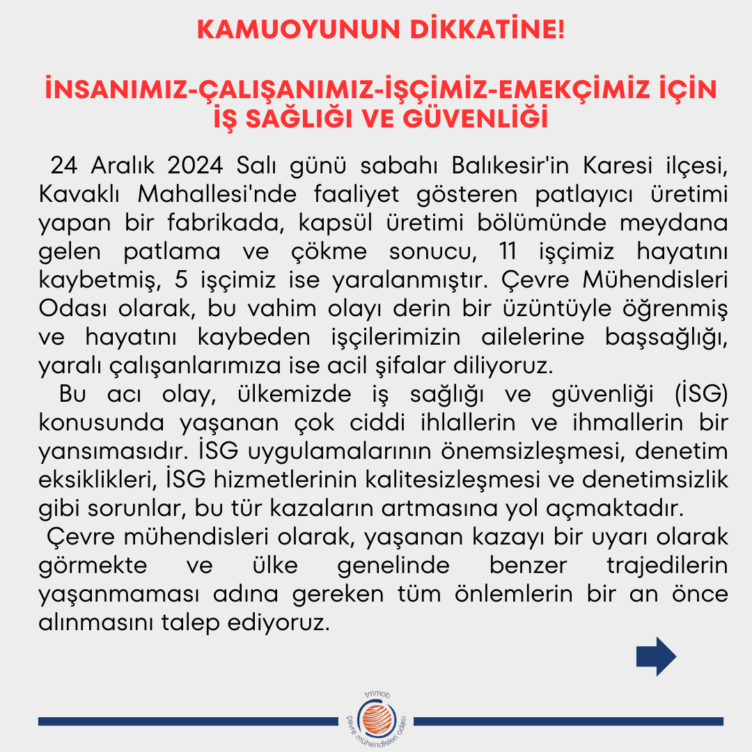 24 Aralık 2024 Salı günü sabahı Balıkesir'in Karesi ilçesi, Kavaklı Mahallesi'nde faaliyet gösteren patlayıcı üretimi yapan bir fabrikada, kapsül üretimi bölümünde meydana gelen patlama ve çökme sonucu, 11 işçimiz hayatını kaybetmiş, 5 işçimiz ise yaralanmıştır. Çevre Mühendisleri Odası olarak, bu vahim olayı derin bir üzüntüyle öğrenmiş ve hayatını kaybeden işçilerimizin ailelerine başsağlığı, yaralı çalışanlarımıza ise acil şifalar diliyoruz.