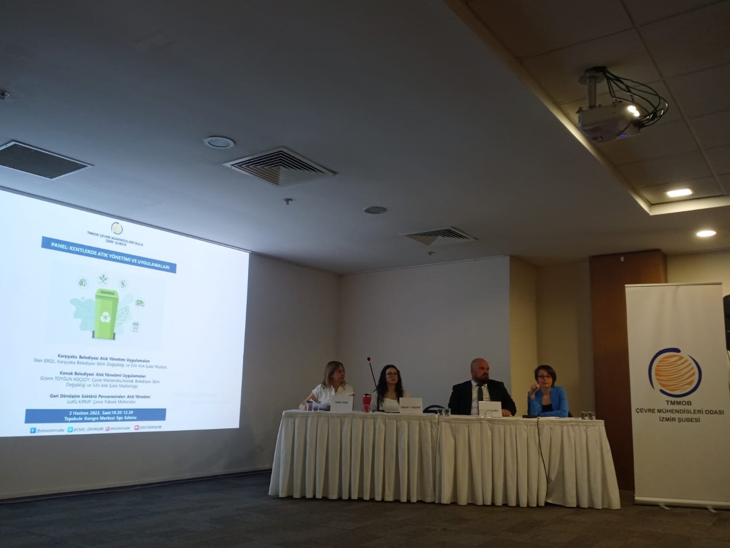 Şube Teknik Sorumlumuz Selma AKDOĞAN’ın moderatörlüğünü üstlendiği panelin açılış konuşmasında Şube Yönetim Kurulu Sekreterimiz A. Mustafa GÜLEŞ tarafından atık yönetiminde sürdürülebilirliğin önemi vurgulanmıştır. Karşıyaka Belediyesi İklim Değişikliği Ve Sıfır Atık Müdürü İlker EROL ve Konak Belediyesi İklim Değişikliği Ve Sıfır Atık Müdürlüğü adına üyemiz Gizem TOYĞUN KOÇSOY sunumları ile Karşıyaka ve Konak Belediyesi uygulamalarını paylaşarak, yerel yönetimlerin penceresinden atık yönetimine ilişkin değerlendirmelerini aktarmışlardır. Üyemiz Çevre Yüksek Mühendisi Lütfü KIPKIP ise "Geri Dönüşüm Sektörü Penceresinden Atık Yönetimi” üzerine görüş ve değerlendirmelerini aktarmıştır.