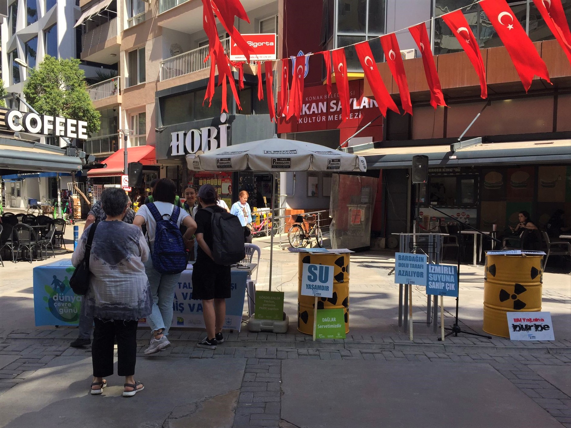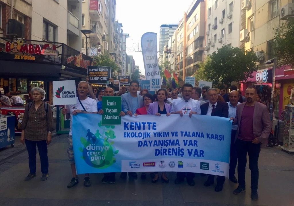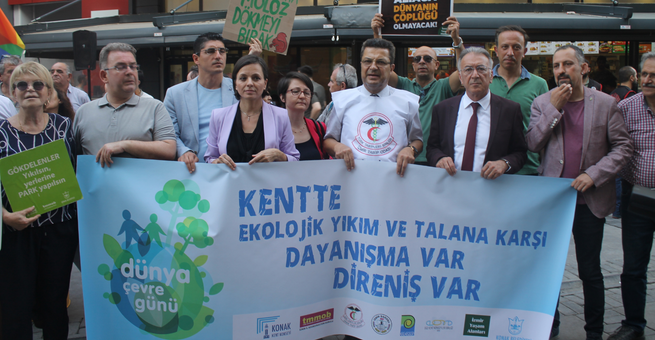 Çevre Mühendisleri Odası İzmir Şubesi olarak sekretaryasını yürüttüğümüz Ekolojik Yıkımla Mücadele Haftası ve Dünya Çevre Günü etkinlikleri kapsamında; 5 Haziran ‘da, TMMOB İzmir İl Koordinasyon Kurulu, İzmir Barosu, İzmir Tabip Odası, Konak Belediyesi, Konak Kent Konseyi, Ege Kent Konseyleri Birliği, EEGEÇEP, İzmir Yaşam Alanları platformu paydaşlığında “Kentte Ekolojik Yıkım ve Talana Karşı Dayanışma Var, Direniş Var” temalı ortak etkinlik gerçekleştirilmiştir. Türkan Saylan Kültür Merkezi önünde başlayan bilgilendirme ve imza masası çalışmalarından sonra İzmir Mimarlık Merkezi önünde devam eden Gezi İçin Adalet Nöbetinden başlayan ve Türkan Saylan Kültür merkezi önünde tamamlanan farkındalık yürüyüşü sonrasında " Ekolojik Yıkıma Karşı Direniş ve Dayanışma Devam Ediyor " teması ile ortak basın açıklaması gerçekleştirilmiştir.